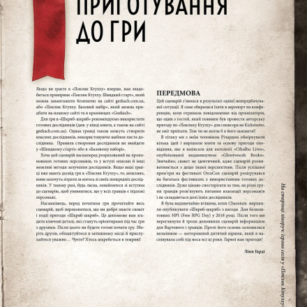 Обратите внимание — если это ваше первое знакомство с «Зовом Ктулху», для игры вам также понадобится экземпляр «Зов Ктулху». Быстрый старт» (электронный формат можно скачать бесплатно) или «Зов Ктулху. Стартовый набор».
