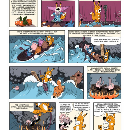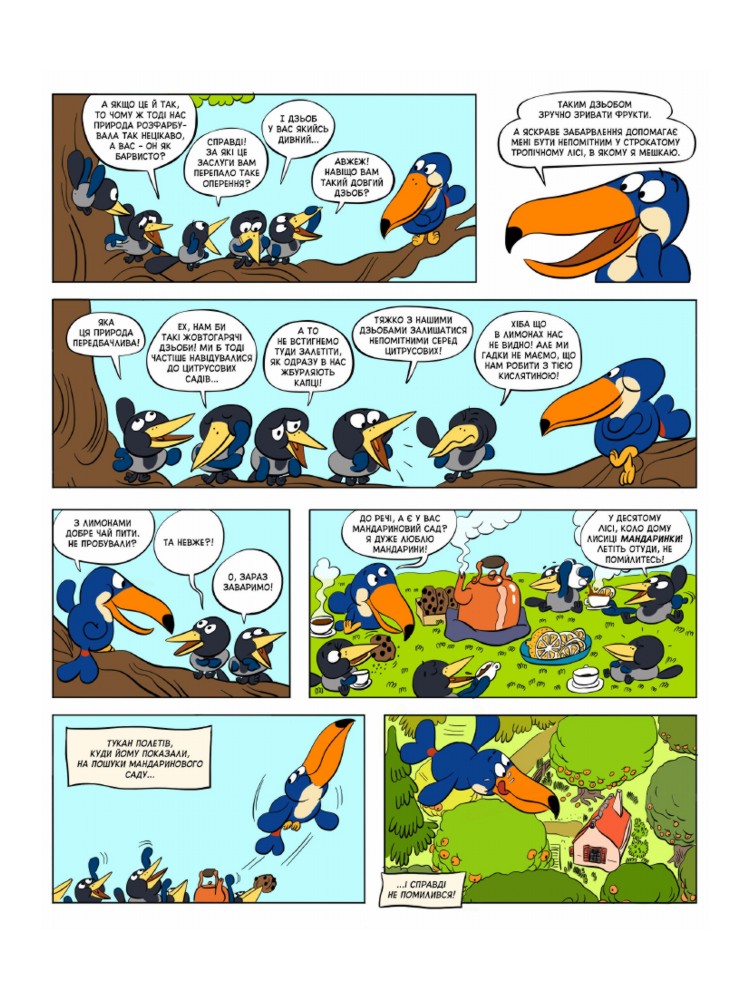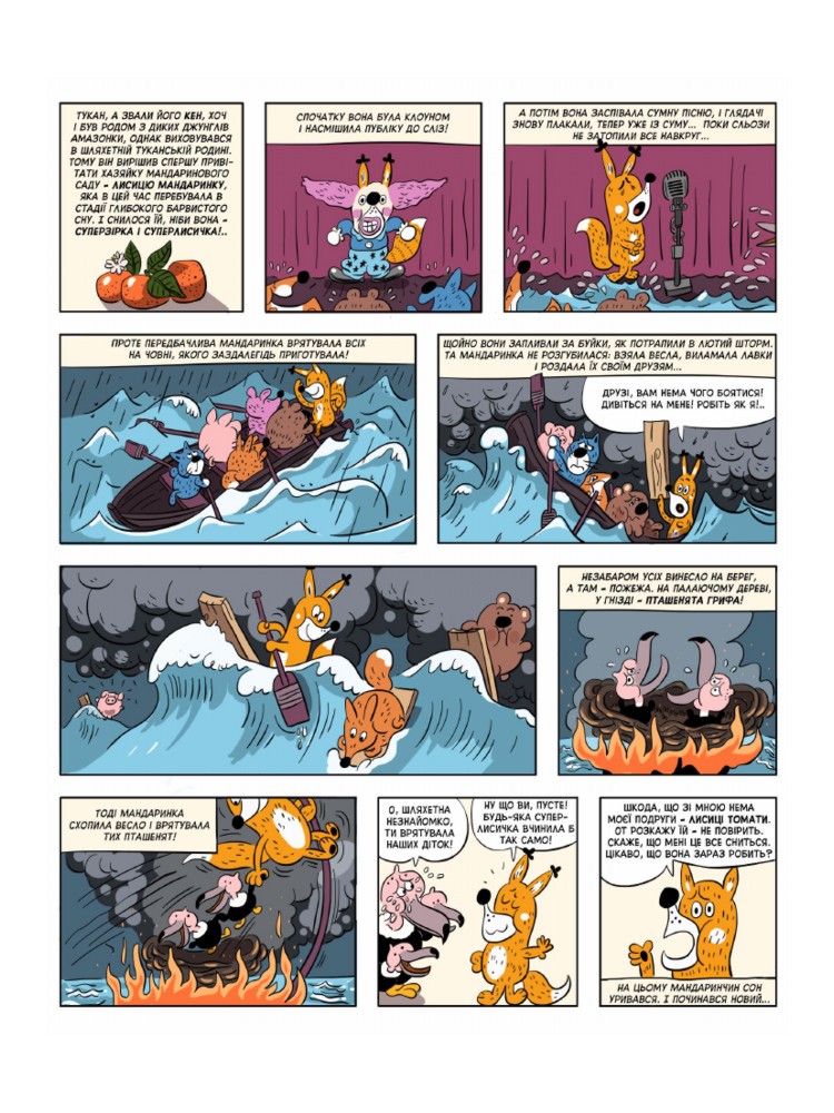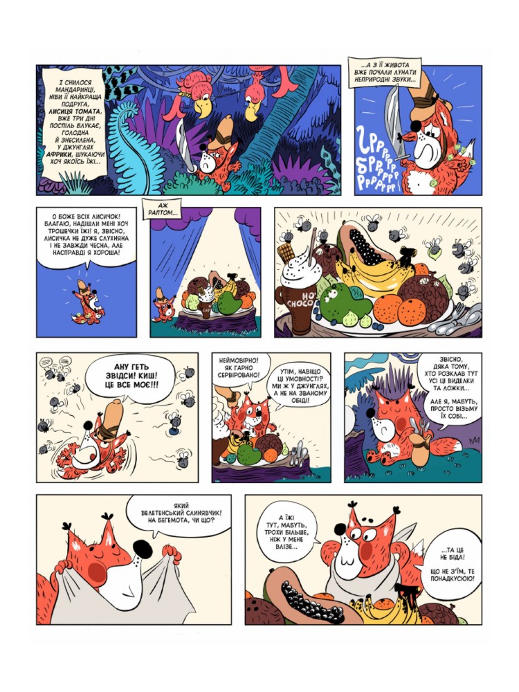 У цій книжці багато малюнків і мало слів, лише для того, щоб було зрозуміло, які мудрі речі виголошує головна героїня, лисичка Томата.