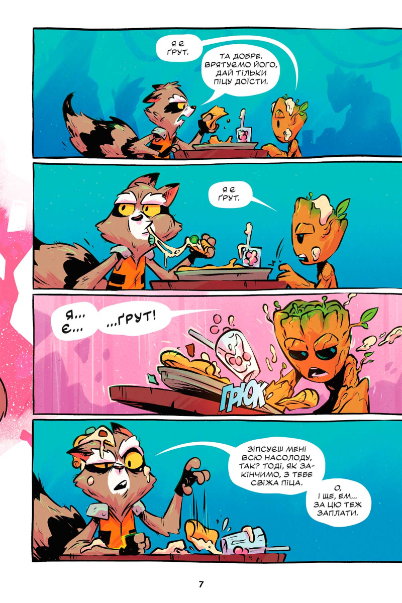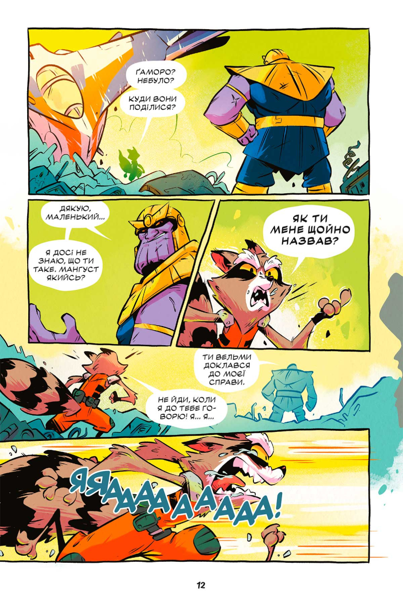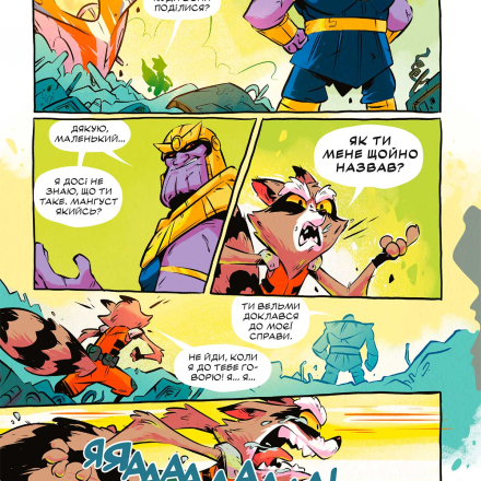 Ракета і Ґрут негайно кидають свої розваги і кидаються в бій. Кому взагалі може знадобитися викрадення Пітера Квілла? Гаразд… можливо, багато кому… Мабуть, найкраще почати з того, кому Пітер насправді подобається? Гамора! Але коли Ракета і Грут знаходять Гамору, вона в самому розпалі битви з Таносом. Чудово! Ще один ворог, з яким треба розібратися…