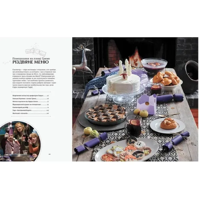 Відтворіть святкову атмосферу Гоґвортсу разом з «Офіційною різдвяною кулінарною книгою за мотивами фільмів “Гаррі Поттер”», де зібрані рецепти, гідні пишного бенкету у Великій залі! У цій неповторній кулінарній книзі, що містить як класичні британські страви, так і фірмові рецепти всесвіту чаклунів та відьом, ви знайдете ідеї для чарівних закусок, поживних основних страв, солодких ласощів та вишуканих напоїв, натхненних атмосферою різдвяних свят у фільмах про Гаррі Поттера.