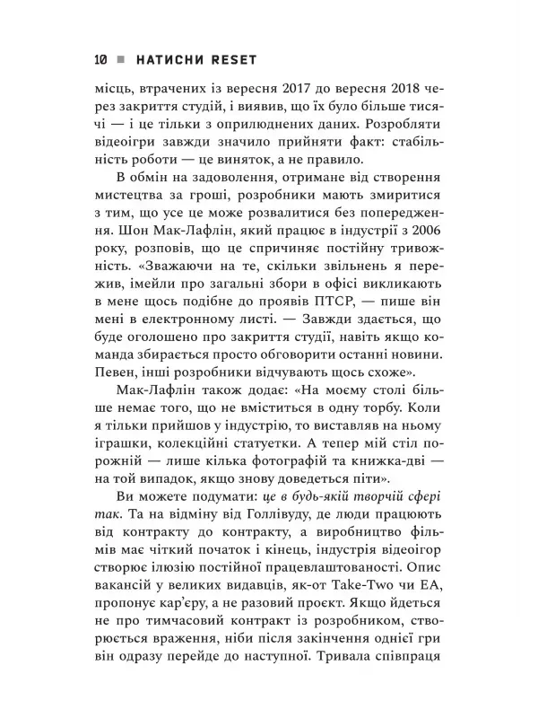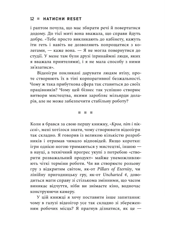 Відеоігровий бізнес — престижна індустрія, але водночас досить ненадійна. «Натисни Reset» — це історії реальних людей, які зазнали наслідків закриття ігрових студій; це оповідки розробників, які відновлюються, рухаються далі чи остаточно покинули справу. Книжка базується на десятках ексклюзивних інтерв’ю, які проведуть залаштунками створення визначних ігор — як-от BioShock Infinite, Epic Mickey, Dead Space тощо, — і аж до щемкого закриття студій, що їх породили.