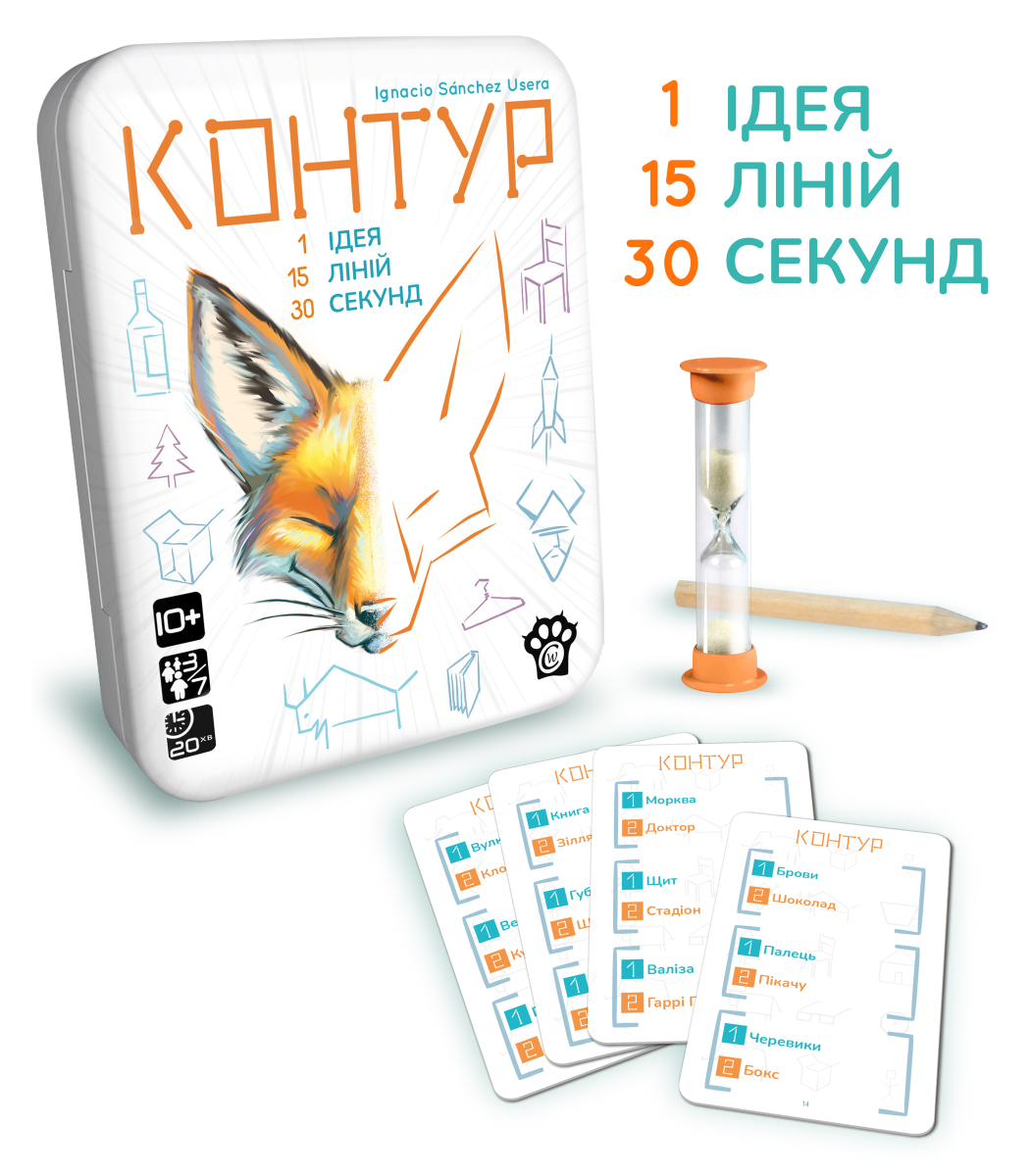 Швидка паті-гра на пояснення слів шляхом малювання прямих ліній. Настільна гра «Kontour» була розроблена у 2018 році. Це дуже цікавий творчий філлер, який підійде і для сімейних посиденьок, і для дружньої вечірки. Гікач гарантує, що він сподобається всім учасникам, незалежно від віку чи ігрового досвіду.