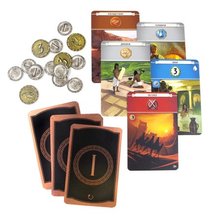 Комплектація: 7 планшетів Чудес світу, 49 карт першої епохи, 49 карт другої епохи, 50 карт третьої епохи, 48 жетонів конфлікту, 78 монет, блокнот для підрахунку балів, 3 пам'ятки з описом ефектів, список карт і ланцюжків, правила.