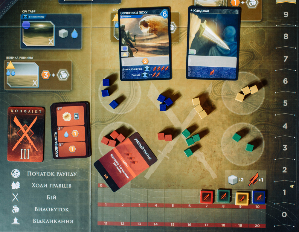 Ваше завдання у грі – набрати найбільшу кількість балів завдяки кровопролитним війнам за спеції, будуванням міцних відношень з великими родами чи накопиченням ресурсів й вправним їх менеджментом, результат залежить лише від вас. У свій хід ви відправляєте агентів у різні локації, використовуючи для цього карти, які докупаються по ходу партії і збільшують ваші можливості та універсальність. Виставляючи своїх воїнів в зону конфлікту, готуйтесь до сутички кожного раунду. Має значення не тільки їх кількість, а й карти інтриг, які ви приготували для битви. Ця гра – сплав із класичних євро-механік, але зона конфлікту вдихнула в гру нотку динаміки, що точно пішло їй на користь та робить кожну партію унікальною.