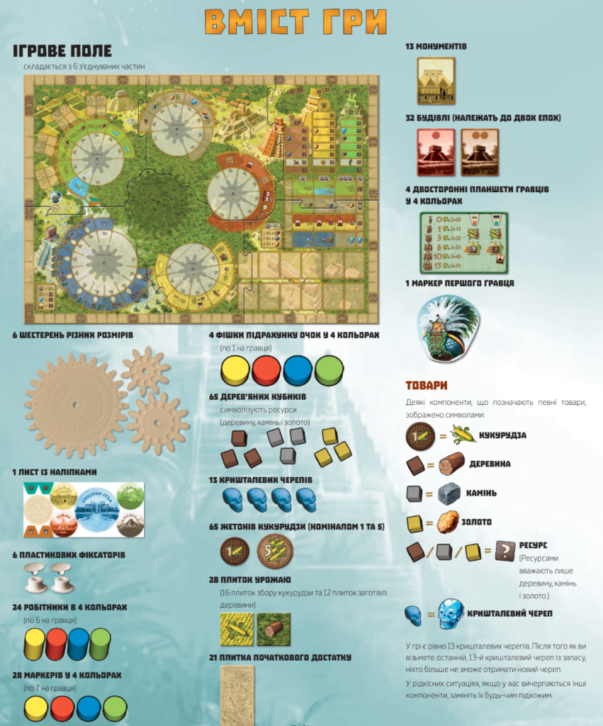 - Коли гравець забирає робітника з шестірні Чичен-Іца, він розміщує на вільній (тобто не зайнятій іншим черепом) комірці кришталевий череп, після чого отримує переможні очки та може просунутися по сходах храмів.