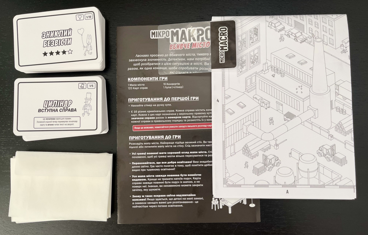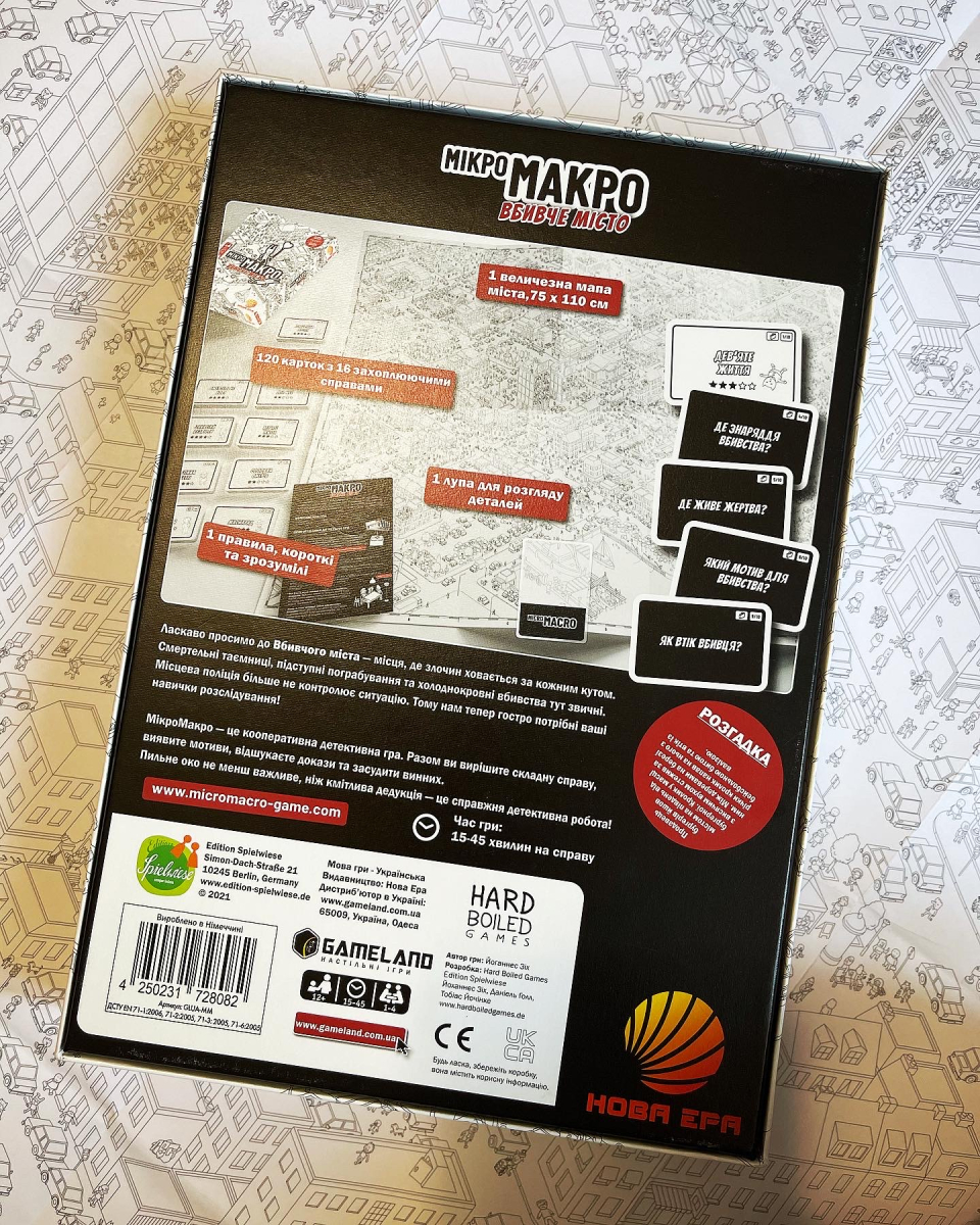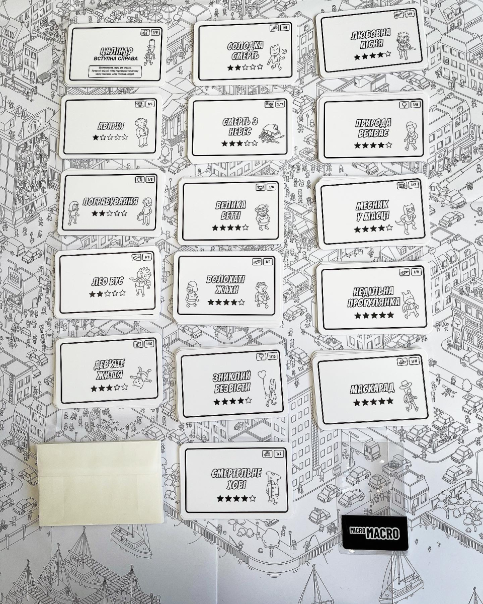 МікроМакро — це кооперативна детективна гра. Спільно ви будете розв’язувати хитрі кримінальні справи, виявляти мотиви, знаходити докази та засуджувати винних. Пильне око настільки ж важливе, як і розумна дедукція - це справжня детективна робота!