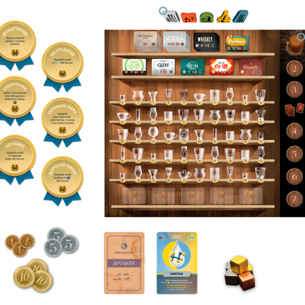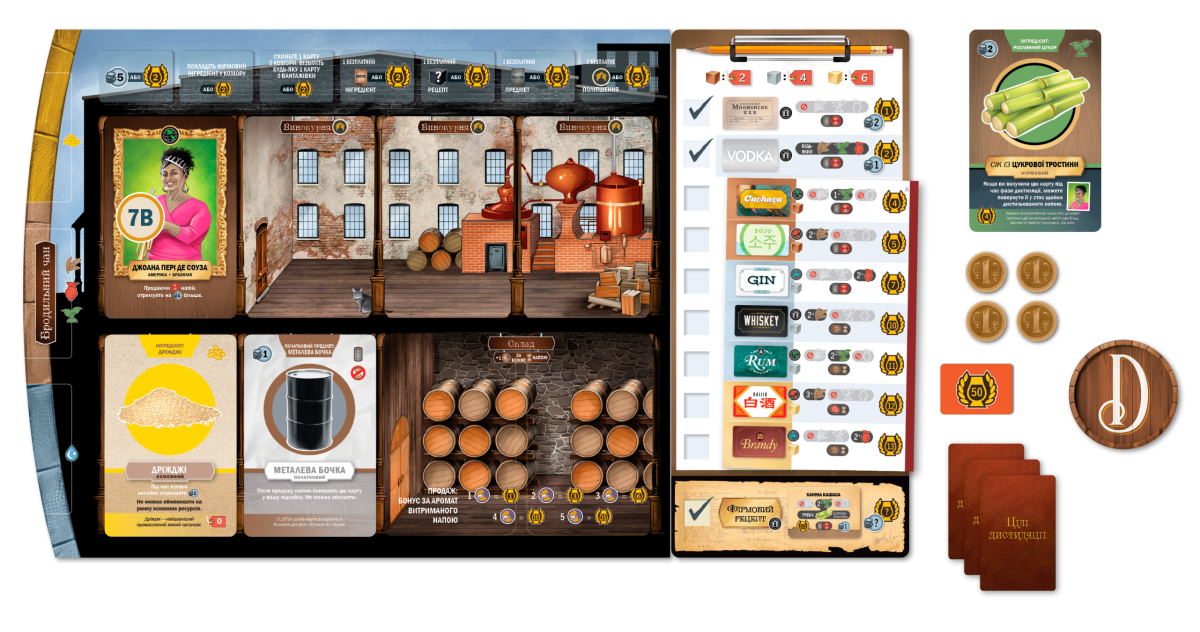 – Кубик рецепта. Він викладає кубик у підхожу комірку на планшеті рецептів. Тепер гравець може дистилювати напої за цим рецептом.