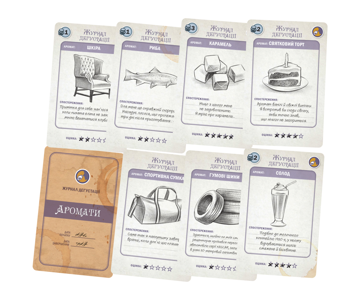 - Напої, що залишилися на складі (очки на картах, на рецепті + 1 очко за кожну карту аромату).