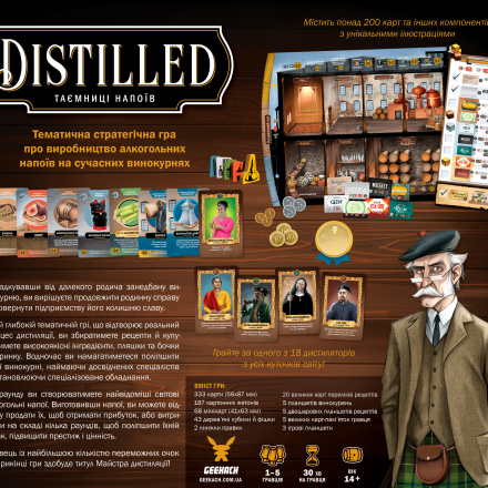 Щораунду ви створюватимете найвідоміші світові алкогольні напої. Виготовивши напої, ви можете відразу продати їх, щоб отримати прибуток, або витримати на складі кілька раундів, щоб поліпшити їхній смак, підвищити престиж і цінність. Гравець із найбільшою кількістю переможних очок наприкінці гри здобуде титул Майстра дистиляції.