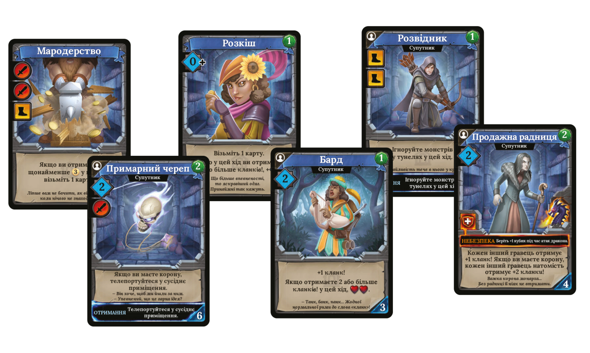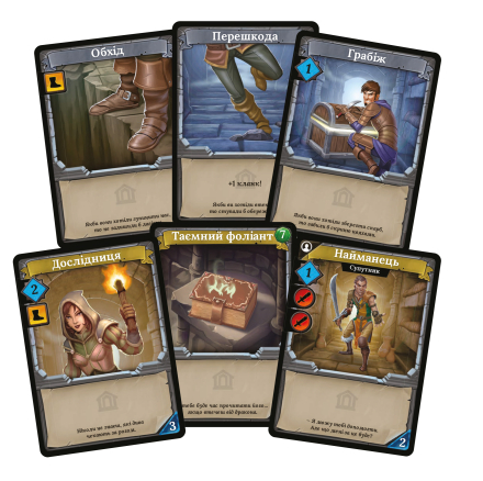 - Отримати карту. Гравець витрачає «вміння», щоб отримати карту з синьою назвою з ряду підземелля або з жовтою назвою із резерву. Отримані карти гравець кладе у свій скид.