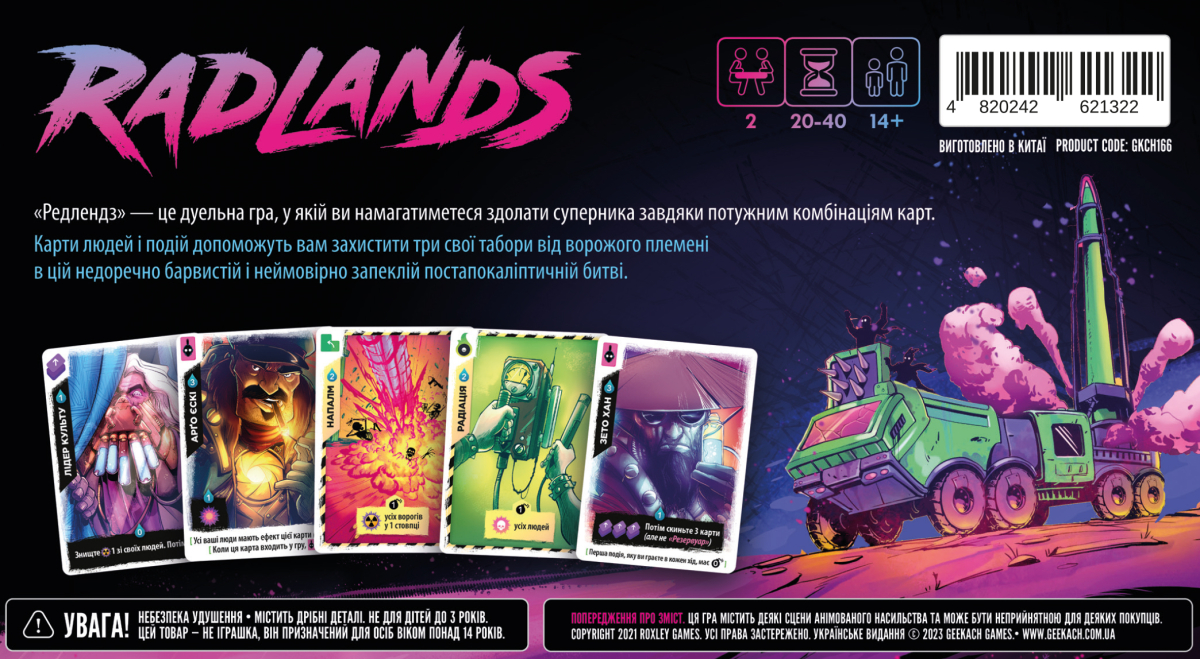 Швидка дуельна гра про запеклі битви за воду в постапокаліптичному світі майбутнього. Настільна гра «Radlands» вийшла в 2021 році. Вона отримала відмінні оцінки та відгуки на сайті «BoardGameGeek». У 2021 році вона ставала переможцем конкурсів «Cardboard Republic Laurel» і «Golden Geek» в категорії «Найкраща дуельна гра», а також номінантом конкурсу «Golden Geek» в категорії «Найкраще оформлення».