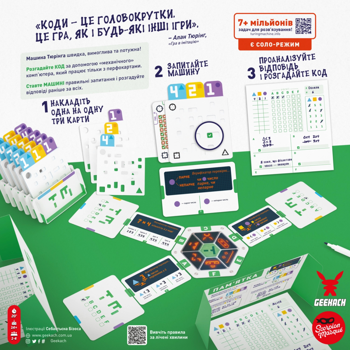 Алан Тюрінг - видатний англійський математик, алгоритм якого допоміг зламати найзахищенішу шифрувальну машину свого часу, німецьку «Енігму, що захищала важливі повідомлення армій Осі від союзників протягом Другої Світової війни. Тюрінг казав, що кожен код - це справжнісінька гра, та був одним серед перших розробників аналогового комп'ютера. Тож дизайнери настільної гри «Turing Machine» не тільки створили справжній аналоговий комп'ютер з картонних перфорованих карт, але й запрошують вас до вирішення понад 7 мільйонів кодів, доступних як у базовій грі, так і у супровідному застосунку!