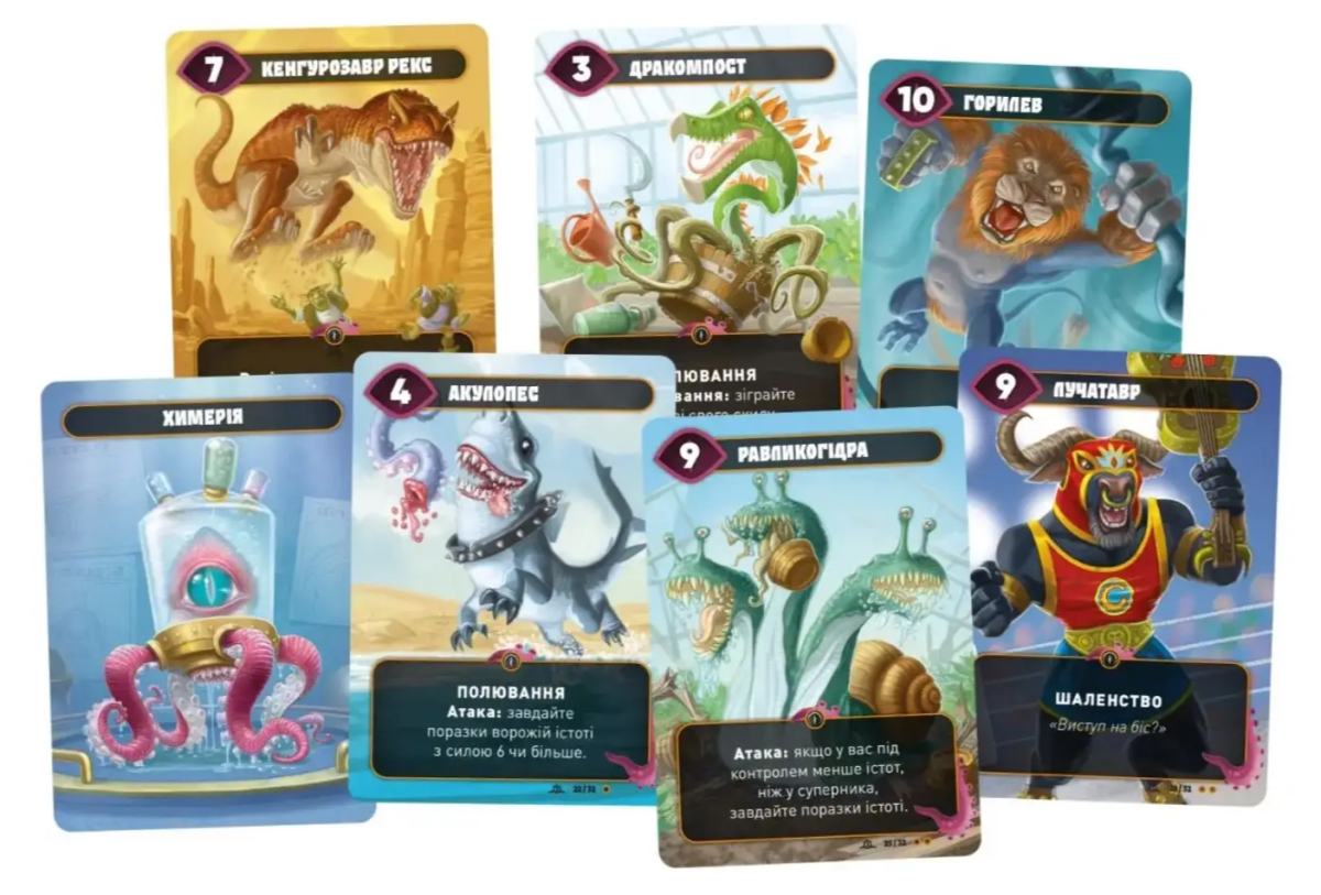 Це космічна дуель, де гравці намагаються довести здоров’я супротивника до нуля, тут нічого нового. Але яким чином – це вже цікаво! Кожен із дуелянтів в порядку черги розігрує карту неймовірних космічних монстрів-гібридів (повірте, тигрова білка це зовсім не те, що ви могли б спершу уявити). Після стадії розіграшу спрацьовують всі унікальні ефекти чудовиська, а на наступний хід він може атакувати.