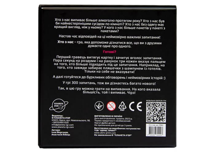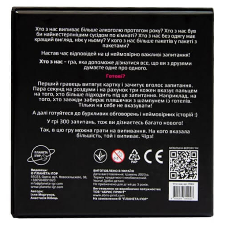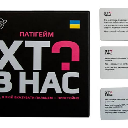 Прикольна гра для великої компанії, в якій учасники відповідають на провокаційні питання. Можна не сумніватися, що гра «Хто з нас?» стане хітом святкової програми. Якщо ви хочете весело провести час і дізнатися багато нового про своїх друзів, Гікач наполегливо рекомендує купити цю гру.