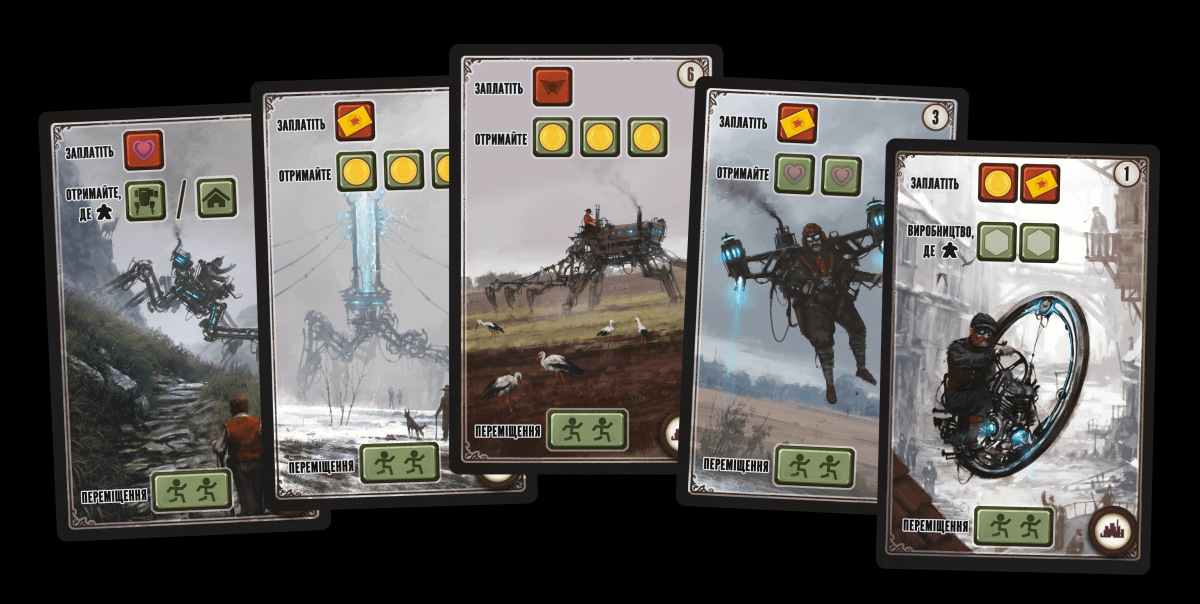 - переміщення, що дозволяє пересунути певну кількість фігурок (робочі, мехи, герой) або отримати монети. Всі фігурки можуть переносити ресурси, мехи можуть перевозити робітників. Герой і мехи можуть переходити річку в певних місцях, якщо побудований мех, який знає броди. Гекси з тунелями вважаються сусідніми. Зайшовши на територію з жетоном пригоди, герой отримує карту пригоди і вибирає один із запропонованих варіантів розвитку подій. Коли герой або мех заходять на територію з бойовими юнітами супротивника, починається бій;