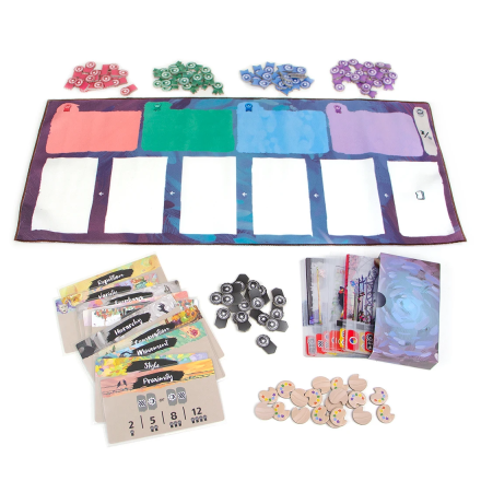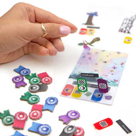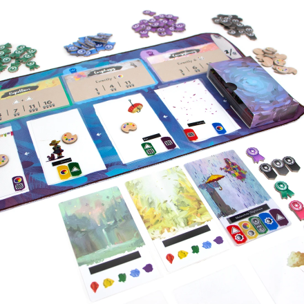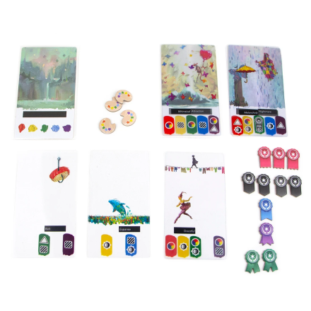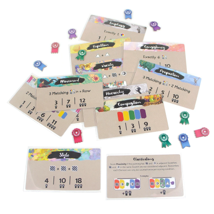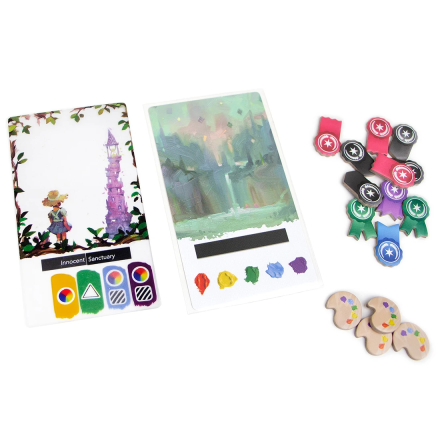 - Завершити картину. Гравець вставляє в протектор три вибрані прозорі карти живопису та карту фону. Потім порівнює видимі символи з умовами на картах переможних очок. За кожен збіг гравець отримує відповідну стрічку із запасу.