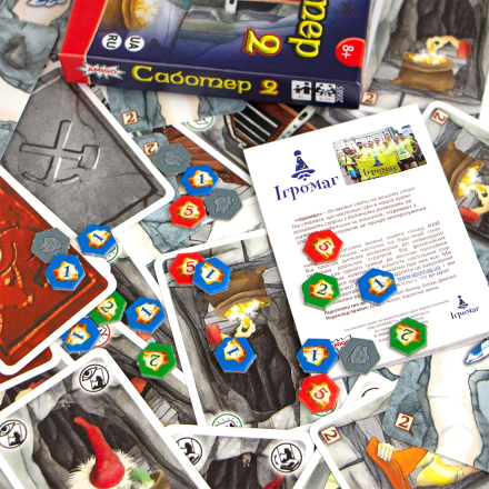 «Saboteur 2» - мастхевне доповнення для чудової паті-гри «Саботер». У комплекті нові карти ролей, нові карти незвичайних шляхів, нові карти витончених дій, а також жетони золотих самородків, якими можна замінити аналогічні карти з базової гри.