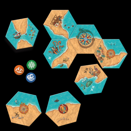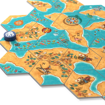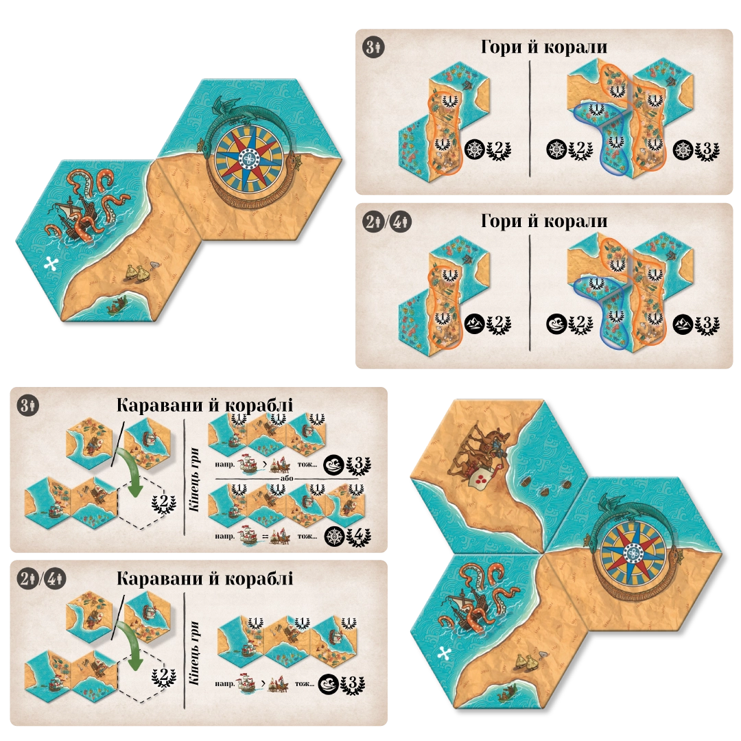 - Покладіть до вже викладених ділянок шестикутник зі свого запасу, так щоб він поєднувався з іншими морем до моря, сушею до суші.