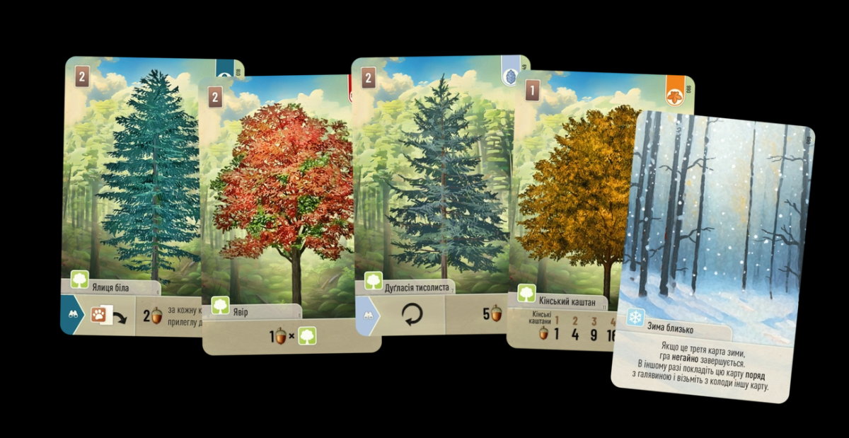 - Карти поділяються на два типи: дерева та лісові мешканці. Розігруючи карти перед собою, гравці утворюють ліс, основою якого є дерева. Зліва, справа, зверху та знизу карти дерева є чотири комірки для заселення. Карти лісових мешканців завжди містять два види, гравець сам обирає який із них хоче зіграти та розмістити поруч з деревом.