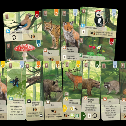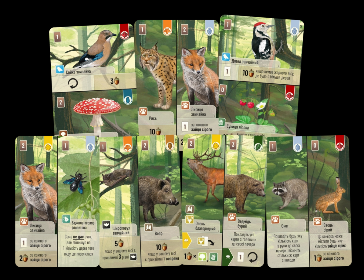 - Карти тварин, рослин та грибів підкладаються під карти дерева таким чином, щоб обраний вид мешканця прилягав до дерева, а інша неактивна сторона карти була перекрита. Деякі лісові мешканці мають негайні або постійні ефекти, пов'язані з певним розміщенням у лісі, чи бонуси за сплачену вартість розіграшу певним кольором карт.