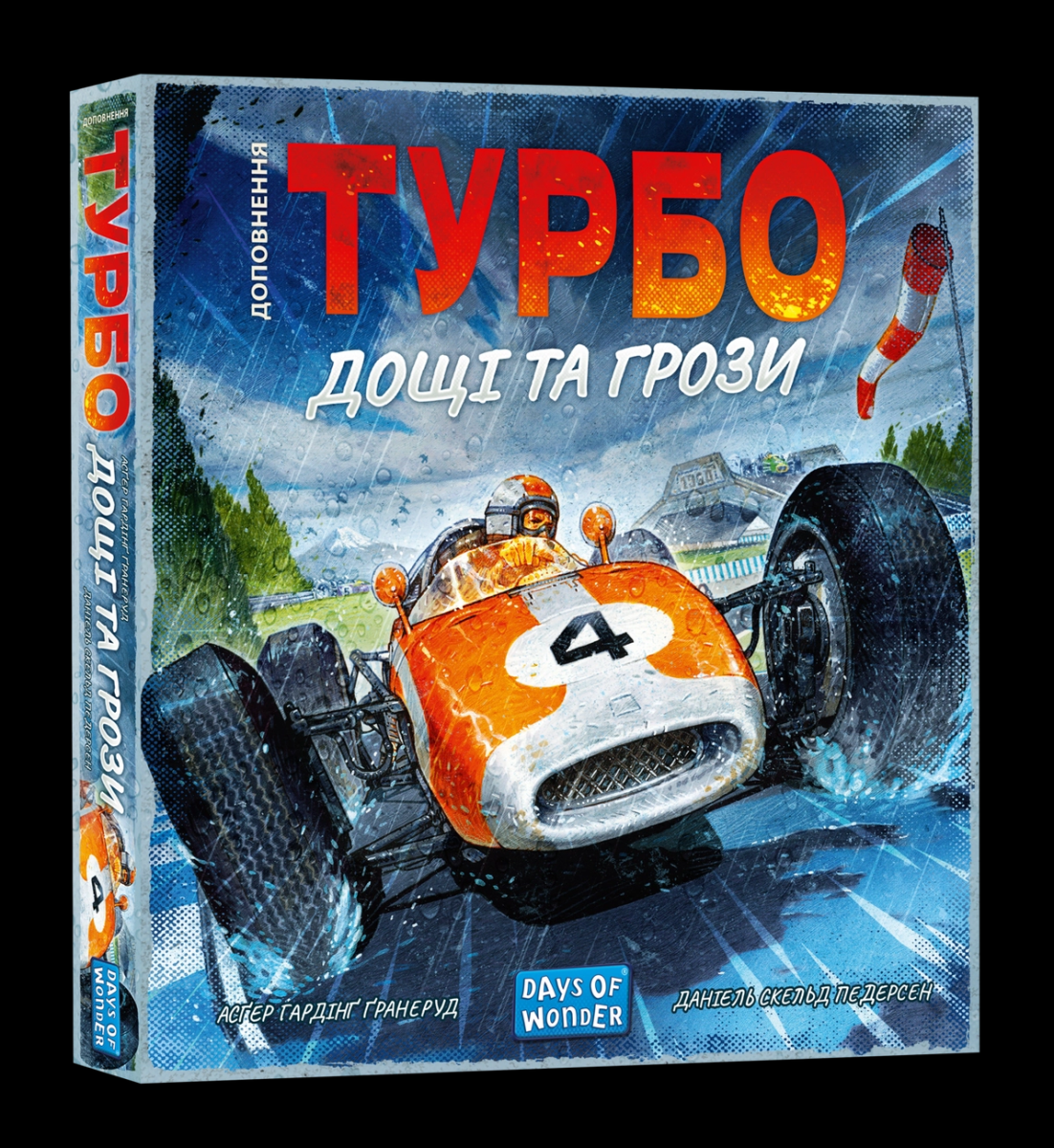 Доповнення «Дощі та грози» додає до гри «Турбо: Спека на треку» серед іншого нові поліпшення, два нових треки та компоненти для сьомого гравця. Карти стресу, турбо, спонсорів, поліпшень та подій замішуються до відповідних базових колод.