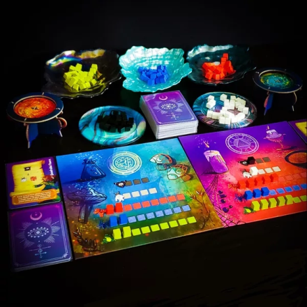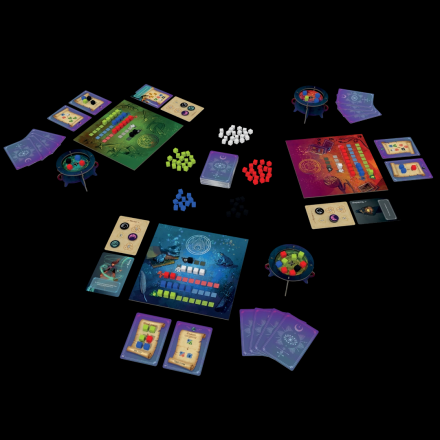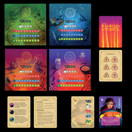 - Роздайте кожному гравцеві планшет стільниці, зібрану картонну фігурку казана, карту аркани, пам'ятку та карту відьми. Для першої гри рекомендовано вибрати для усіх гравців карти «Посвячених», і вже потому, як ви ознайомитесь з ігроладом, роздавати усім учасникам по дві випадкових карти, з яких вони мусять обрати й залишити собі одну.