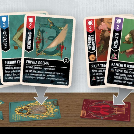 - Комбінація зі скидом.Верхня карта скиду Червоної шапочки – «корзинка». На її вміст вказує зображення на карті, яка буде на той момент верхньою. Від цього можуть спрацювати різноманітні додаткові ефекти на картах героя.