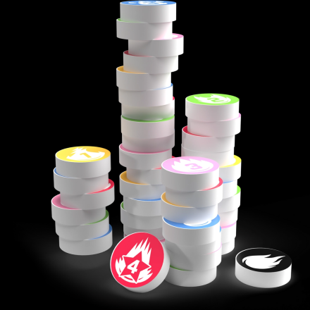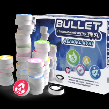 Повний набір дерев'яних куль і маркерів очок дій, щитів і запеклості для гри «BULLET. Головоломний шутер». Гікач впевнено радить замовити цей набір задля косметичного покращення ігрового досвіду – дерев'яні компоненти круто виглядають і приємні на дотик.