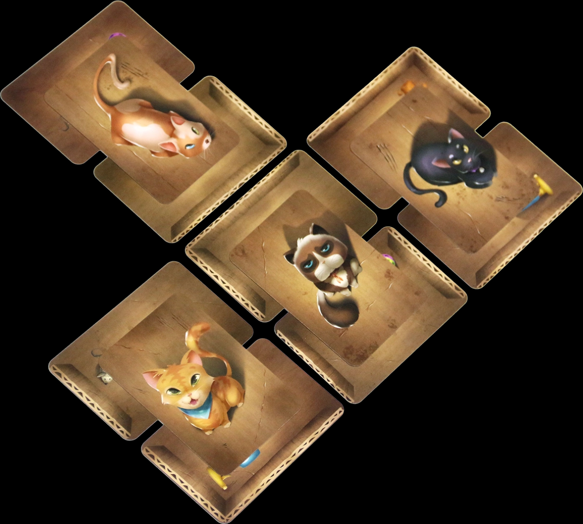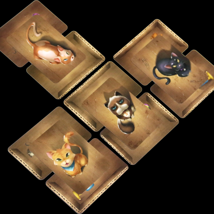 - Карти котів розміщуються на двох картах коробок (одна з яких має бути щойно розіграною), з'єднаних довгими боками, не перетинаючи стінки.