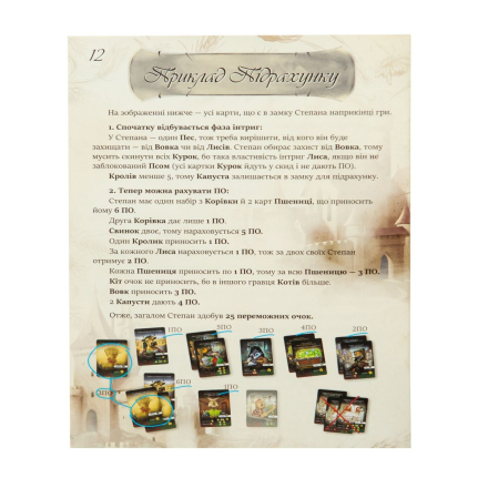 - Фаза інтриг. Коли колода вичерпується, всі гравці по черзі застосовують ефекти карт тварин у своєму замку, починаючи з того, хто робив останній хід.