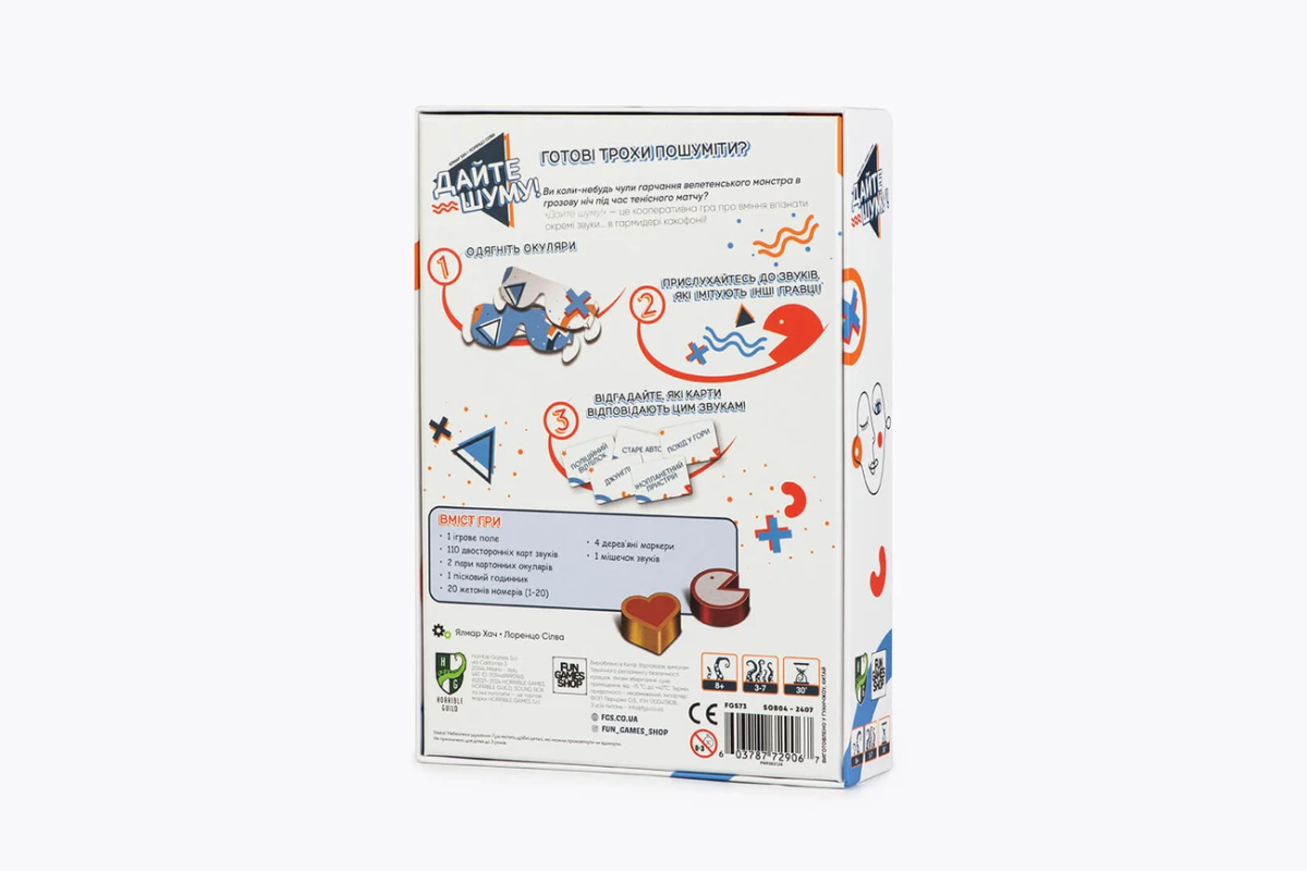 «Дайте шуму!» — кооперативний патігейм, де у справжній какофонії ви повинні знайти підказки. Гравці одночасно імітують різноманітні звуки, поки слухач має здогадатися, які саме поняття відтворює кожен з учасників. Кожен раунд перетворюється на феєричне шоу, де вам доведеться проявити свою креативність та уяву.