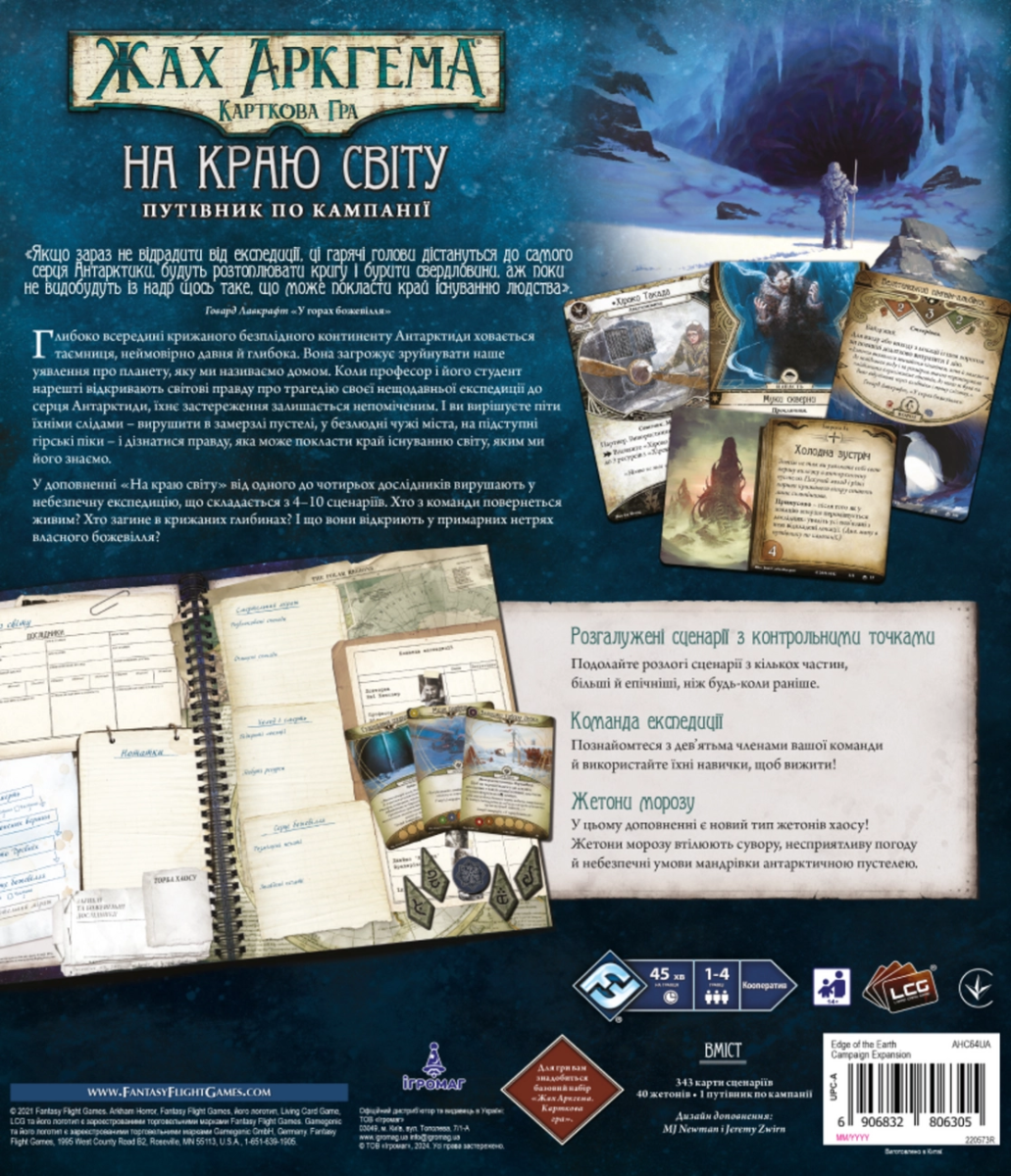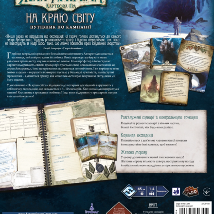 «На краю світу. Путівник по кампанії» — це доповнення для кооперативної карткової гри «Жах Аркгема: Карткова гра». Ви станете дослідниками, які протистоять древнім зловісним силам і намагаються розгадати моторошні таємниці світу, натхненного творчістю Говарда Лавкрафта. Ігрова історія розгортається через серію взаємопов’язаних сценаріїв. На шляху ви зустрінете пастки, небезпечних монстрів, божевілля та інші загрози. Ваша мета — збирати зачіпки, досліджувати локації та уникати небезпек, щоб протистояти темним силам.