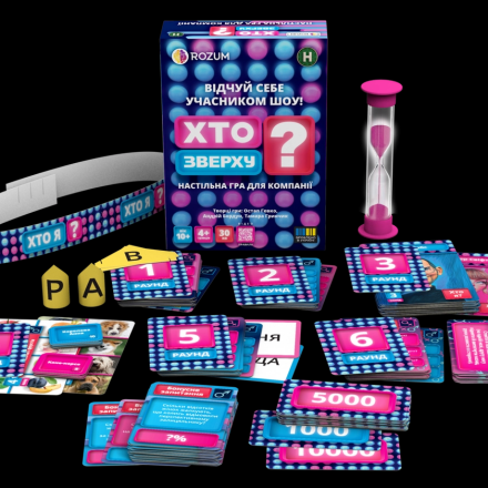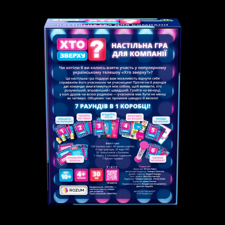«Хто зверху?» — творча командна гра, що є адаптацією популярної телепрограми. Учасники змагаються в дотепних завданнях, відповідають на запитання та демонструють свої вміння й навіть фізичну силу. Гра поєднує найкращі моменти шоу та нові завдання, а також дає змогу додати власні ідеї для конкурсів. Динамічні раунди та веселий суперницький дух гарантують незабутні емоції та гарний настрій для всіх.