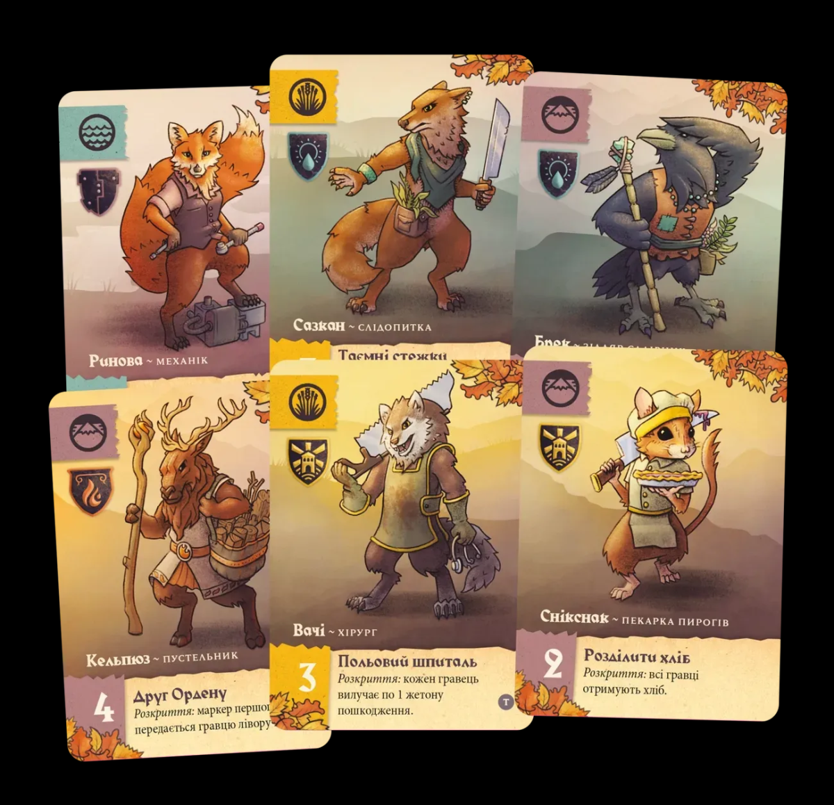 - Орден. Науковці, охоронці вогню, картографи й бібліотекарі. Офіційні літописці тваринного світу, які практикують мистецтво ворожіння на полум’ї, завдяки чому часто зазирають у минуле й іноді передбачають майбутнє. Рідна місцевість — ліси.