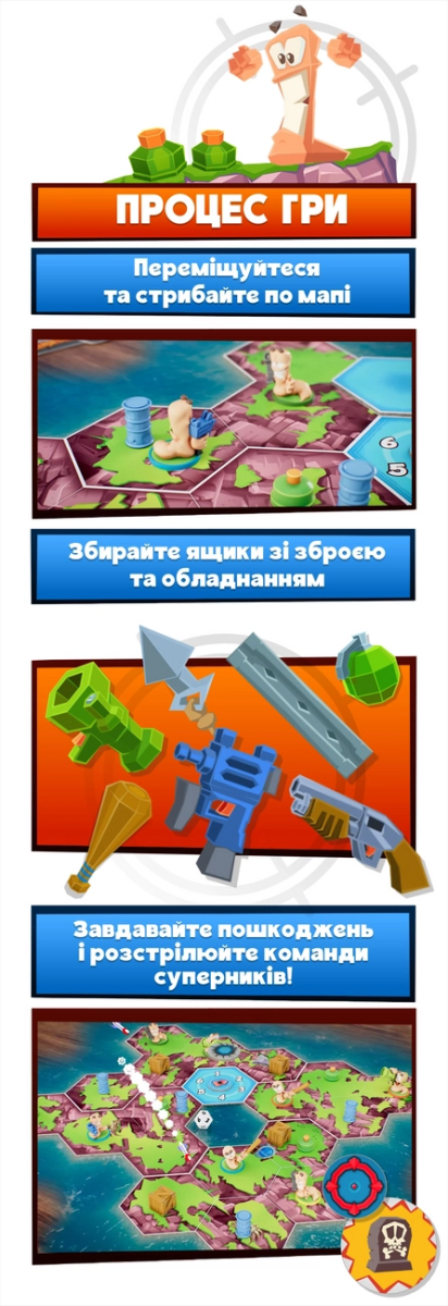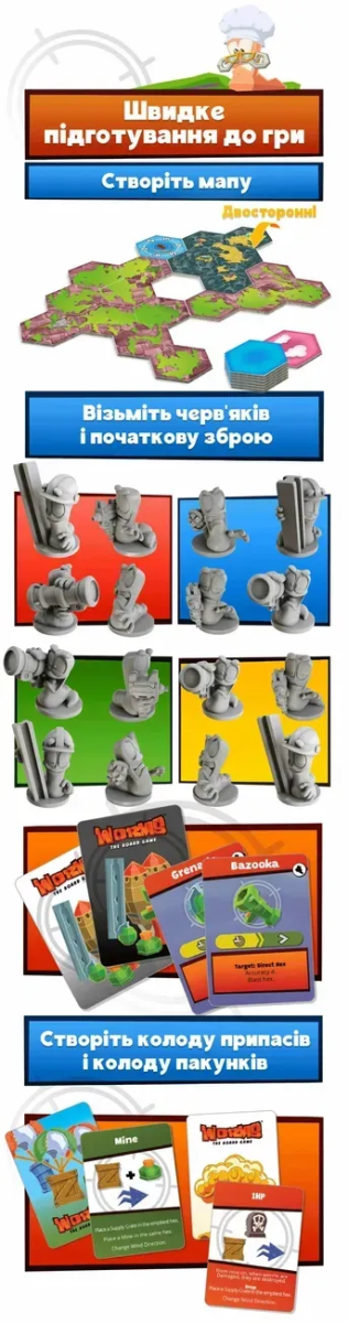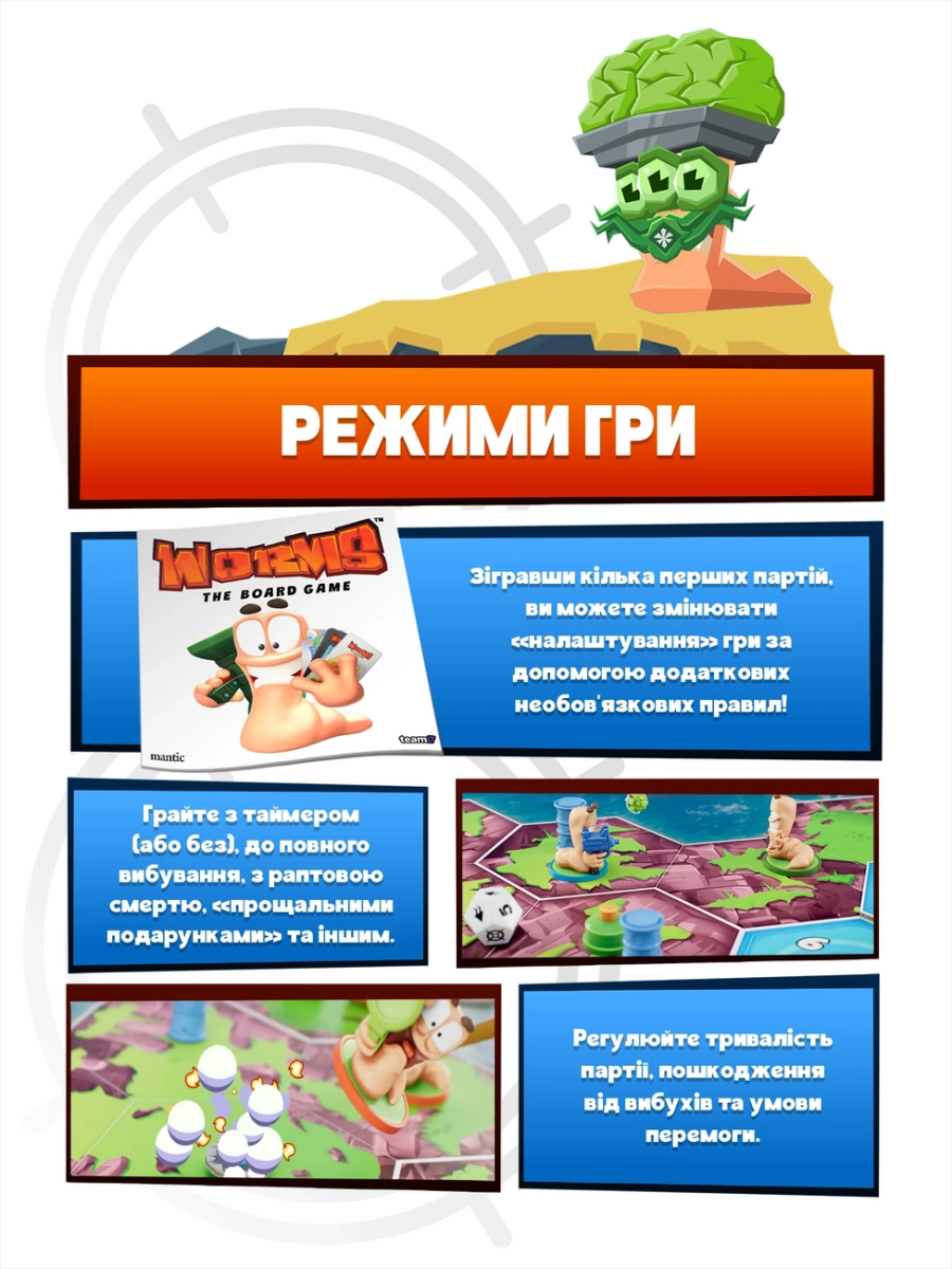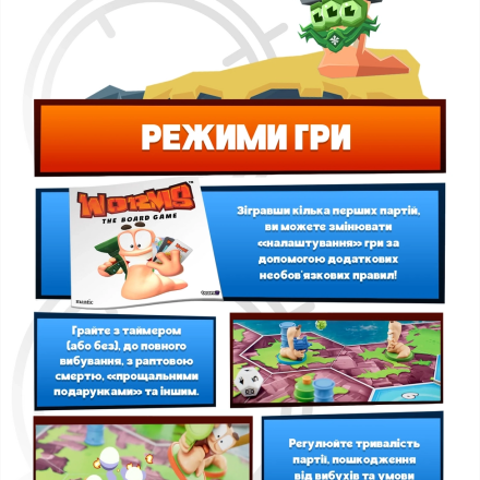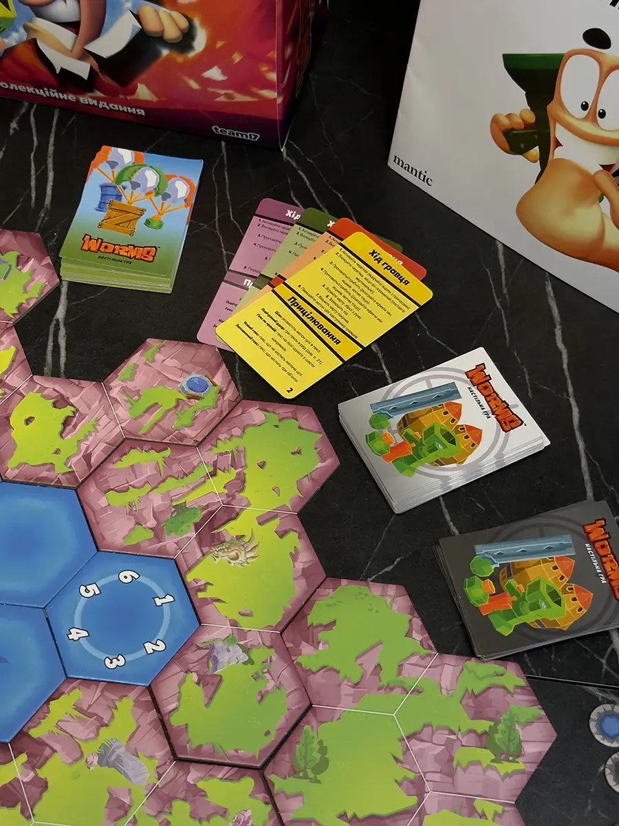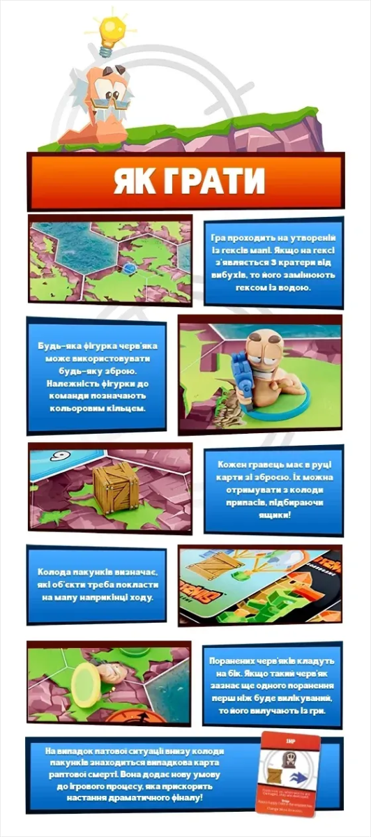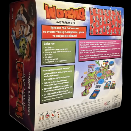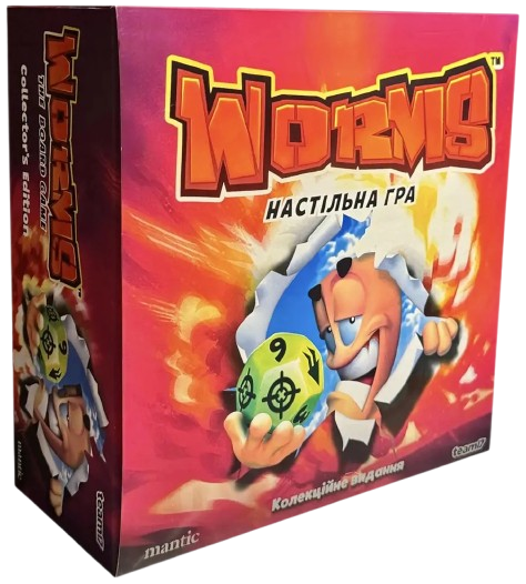 «Черв’ячки» — настільна адаптація культової відеогри, яка переносить вибуховий хаос та шалену тактику на стіл! Ви керуєте командою черв'ячків, що борються на ігровому полі, створеному з плиток. Руйнуйте ландшафт, відправляйте суперників у повітря та вигравайте завдяки кмітливості й влучності. У вашому арсеналі — легендарна зброя: базуки, бананові бомби, гранати та навіть вівці. Продумуйте кожен постріл, щоб завдати максимальної шкоди — враховуйте вітер, непередбачувані траєкторії та примхи кубиків, адже одна помилка може обернутися вибуховою катастрофою… для вас самих!