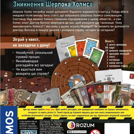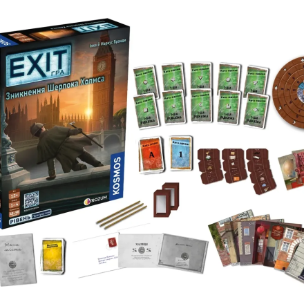 «EXIT: Зникнення Шерлока Холмса» — гра-квест у жанрі «escape the room». Серія «EXIT» поділяється на випуски різної складності, і цього разу — просунутої. У цьому настільному квесті гравці знову опиняться в пастці. Щоб вибратися на свободу, доведеться застосувати свою логіку та кмітливість.
