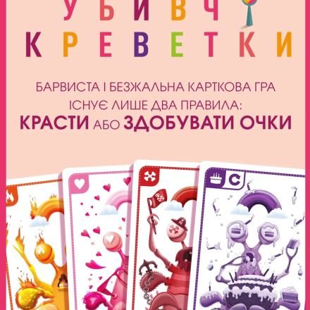 «Убивчі креветки» — яскрава гра на збирання сетів від творців популярної серії ігор «Вибухові кошенята». Імітуючи спосіб життя раків-богомолів у запеклих боях із суперниками, ви будете заробляти очки і красти карти з цими різнокольоровими істотами одне в одного. Гра сповнена швидких рішень, динамічної взаємодії між учасниками і чудово підходить для молодших гравців.