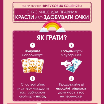 - Вкрасти. Гравець додає карту долілиць у запас іншого гравця, після чого її відкриває. Якщо вона не збігається за кольором із жодною іншою картою суперника, то залишається на місці, а якщо збігається, гравець краде всі карти відповідного кольору у свій запас. Що більше ви вкрали, то бажанішою ціллю для інших стаєте.