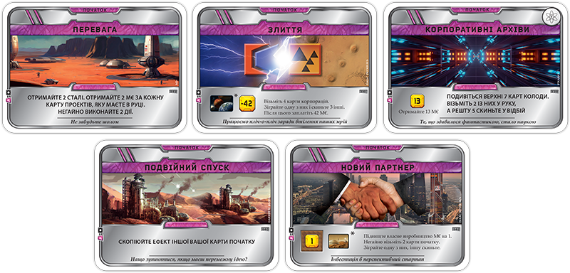 Після вибору корпорації кожен гравець отримує одну карту Початку. Її ефект застосовується одразу — ще до початку першого покоління. Це може бути додатковий ресурс, нова дія або стартова перевага, яка формує унікальний темп гри. Після розіграшу карту можна або залишити, або скинути — залежно від стратегії.