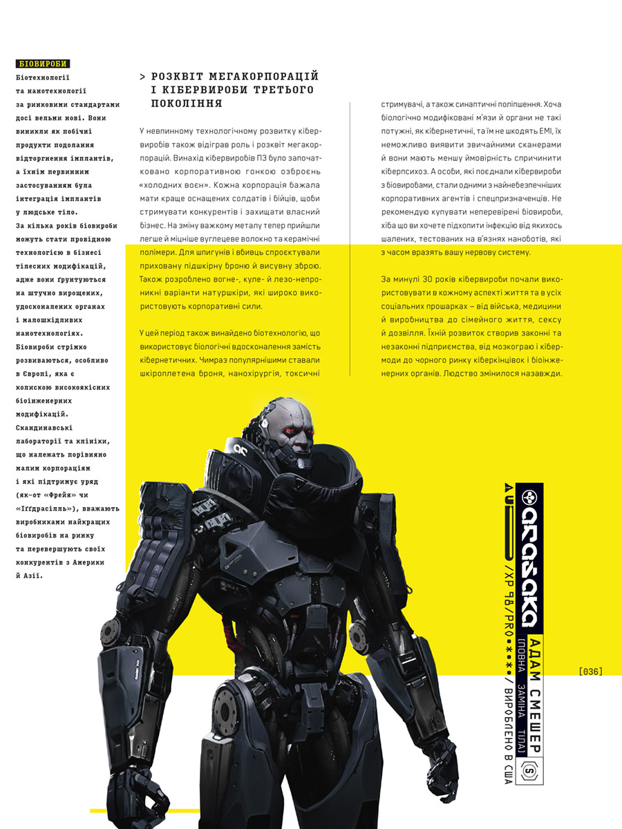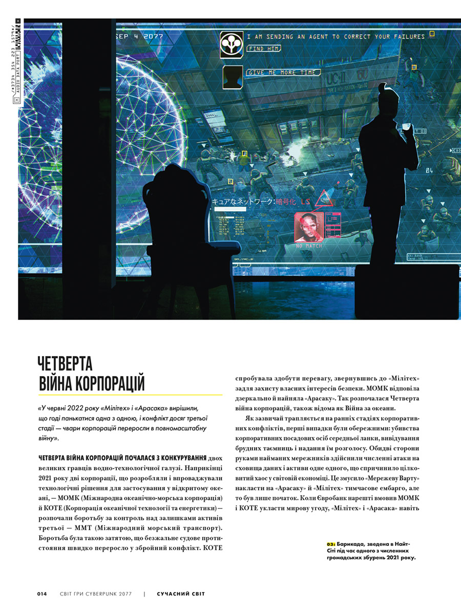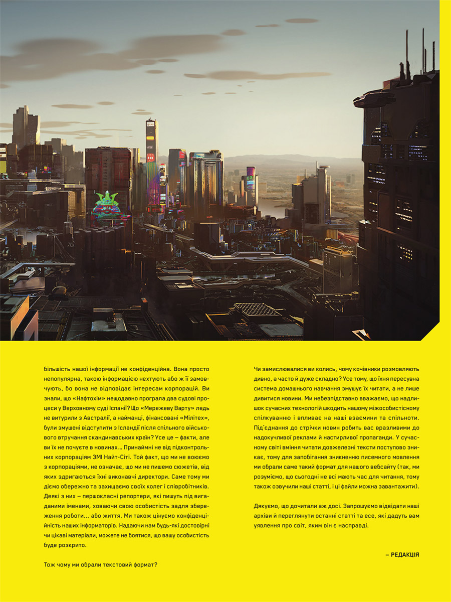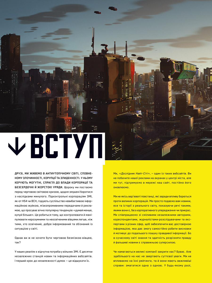 Пориньте у 2077 рік, у сві дистопічних метрополій, де насильство, гноблення та імплантати кіберпрофілів не просто поширилися навколо – вони тепер необхідні інструменти для досягнення успіху. Долучетеся до знань про економічний занепад Сполучених Штатів, який спричинив залежність людей від коварних корпорацій і породив Вільний штат Каліфорнія. Вивчіть різні райони, банди та історію міста. Дізнайтеся все, що потрібно знати про технології найближчого майбутнього, вивчіть кібернетику, зброю та транспортні засоби Cyberpunk 2077. Ця книга – велика збірка знань про всесвіт відеогри Cyberpunk 2077, в якому є все, що потрібно знати про історію, персонажів та світ довгоочікуваного шедевра від творців серії відеоігор Відьмак.