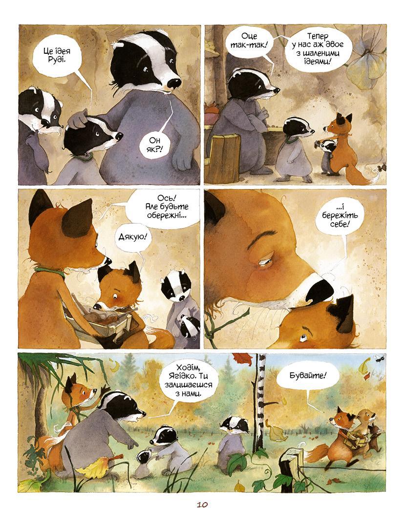 Лисичка Рудя та її мама Маргарита, а також борсученята Кусь, Гризь і маленька Ягідка та їхній тато Едмон живуть однією сім’єю після того, як лисячу нору зруйнували мисливці. І хоча лисиці й борсуки дуже різні — лисиці полюбляють безлад, вони швидкі та метушливі, а борсуки повільні та розважливі і понад усе цінують порядок, — це не заважає їм ставитися з повагою одне до одного.