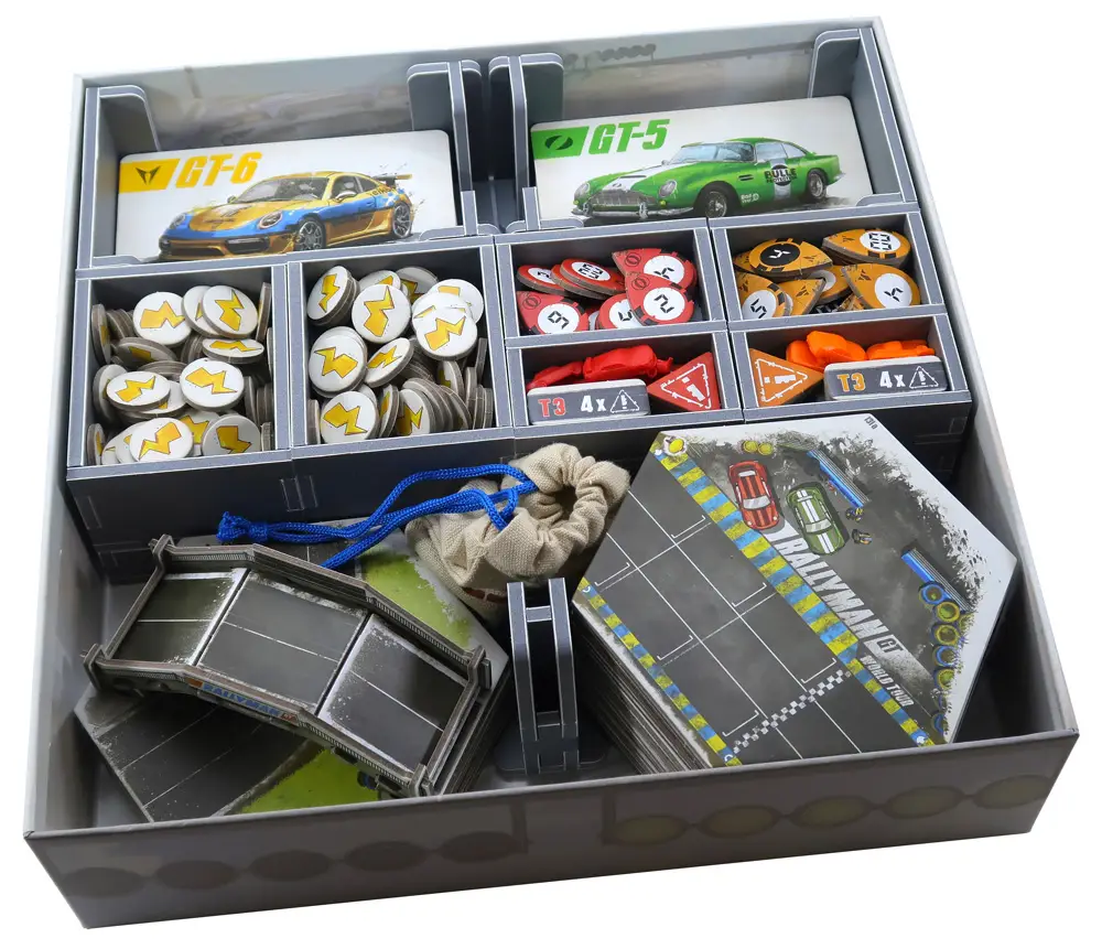 Органайзер для игры Rallyman: GT позволит хранить все компоненты в полном порядке и избавит от ненужной траты времени по разбору и сортировке игровых элементов.