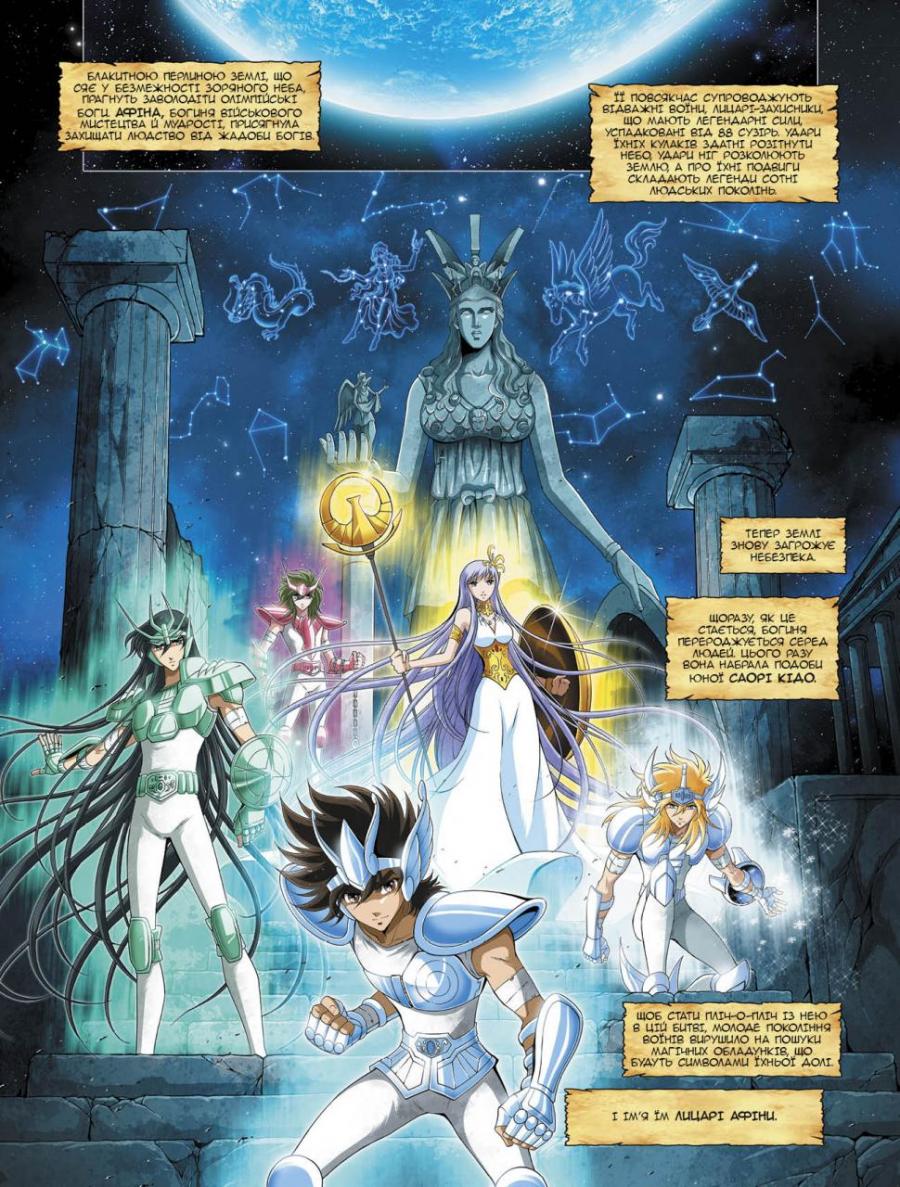 Ее защищают блестящие воины, унаследовавшие могущество и свои доспехи от небесных созвездий. Молодое поколение рыцарей Афины — Сейя (бронзовый доспех Пегаса), Ширю (бронзовый доспех Дракона), Шюн (бронзовый доспех Андромеды), Хёга (брон-