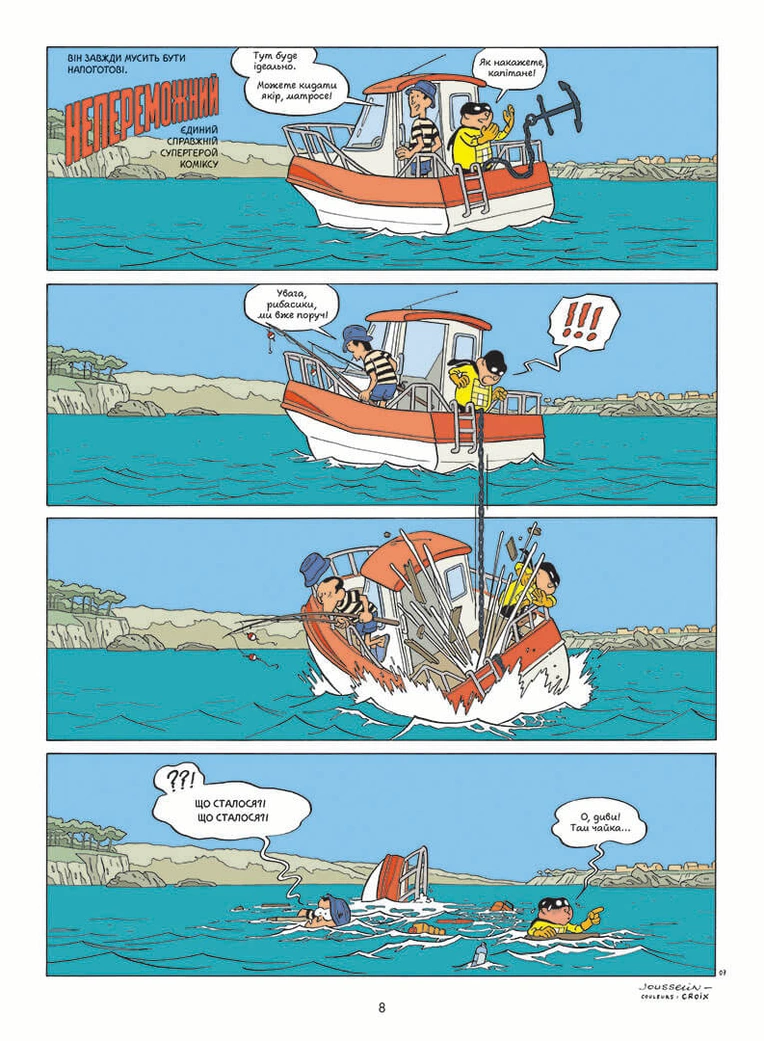 Паскаль Жусселен превратил сетчатую структуру страниц комикса в поле для нарративных экспериментов, в игровое пространство, где персонажи обладают полной свободой передвижения. Его супергерой перепрыгивает с одной клетки на другую, играет со смещениями кадров и переходами между страницами.