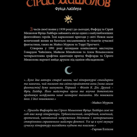 Под жесткой обложкой собраны 7 историй о двух эксцентричных, жадных и эгоистических друзьях-авантюристах, которые не собираются спасать мир, если, конечно, им за это не заплатят. В Ланкмаре Фафхрд и Серый Мышелов ищут денег, женщин и пойла, а встречают, как водится, приключения!