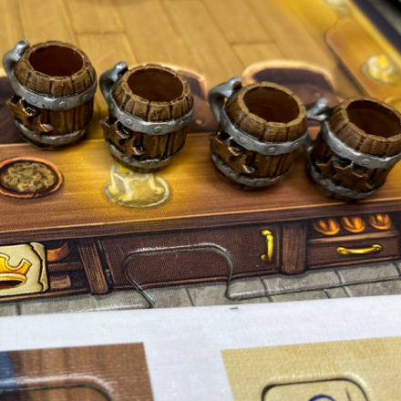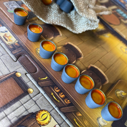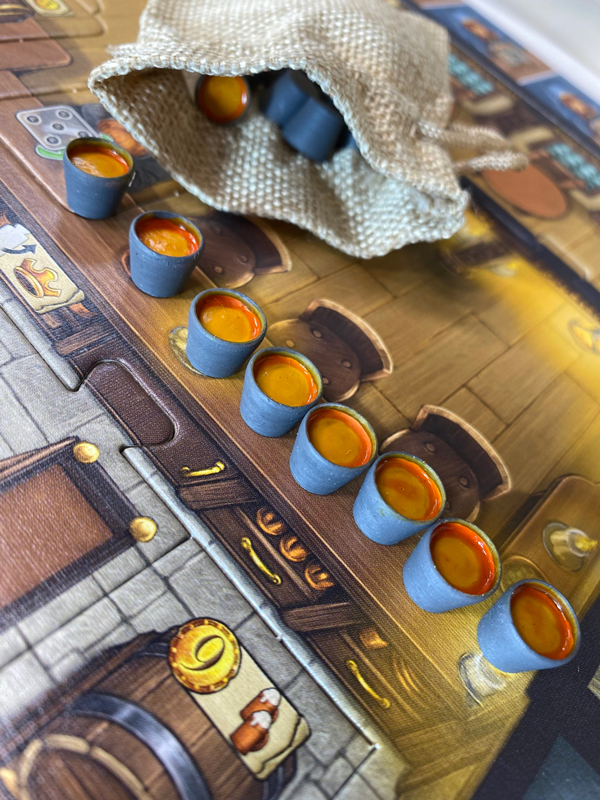 Комплектация: 76 премиальных фишек: 4 бочки (18х15 мм), 4 мешочка с талерами (20х15 мм), 4 маркера монастыря по цветам игроков (6х16 мм), 4 кружки (13х17 мм), 20 фишек шнапса (8х10 мм), 40 фишек подписей (+4 дополнительные запасные фишки)(5х20 мм) и мешочки для хранения фишек