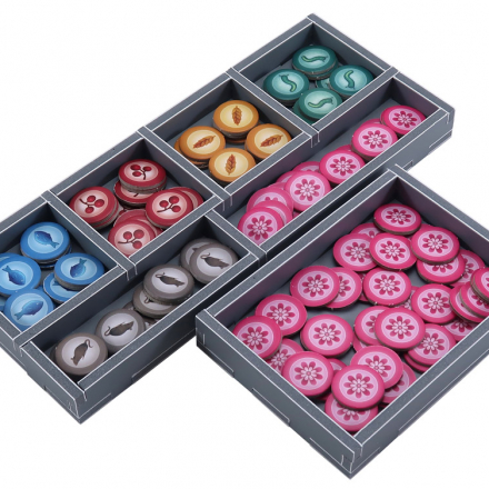 Органайзер включает место для этих расширений: European Expansion® Oceania®. Органайзер Folded Space изготовлен из Evacore, легкого, упругого материала. Материал не имеет запаха и не токсичен. Секции органайзера можно использовать непосредственно во время игрового процесса.