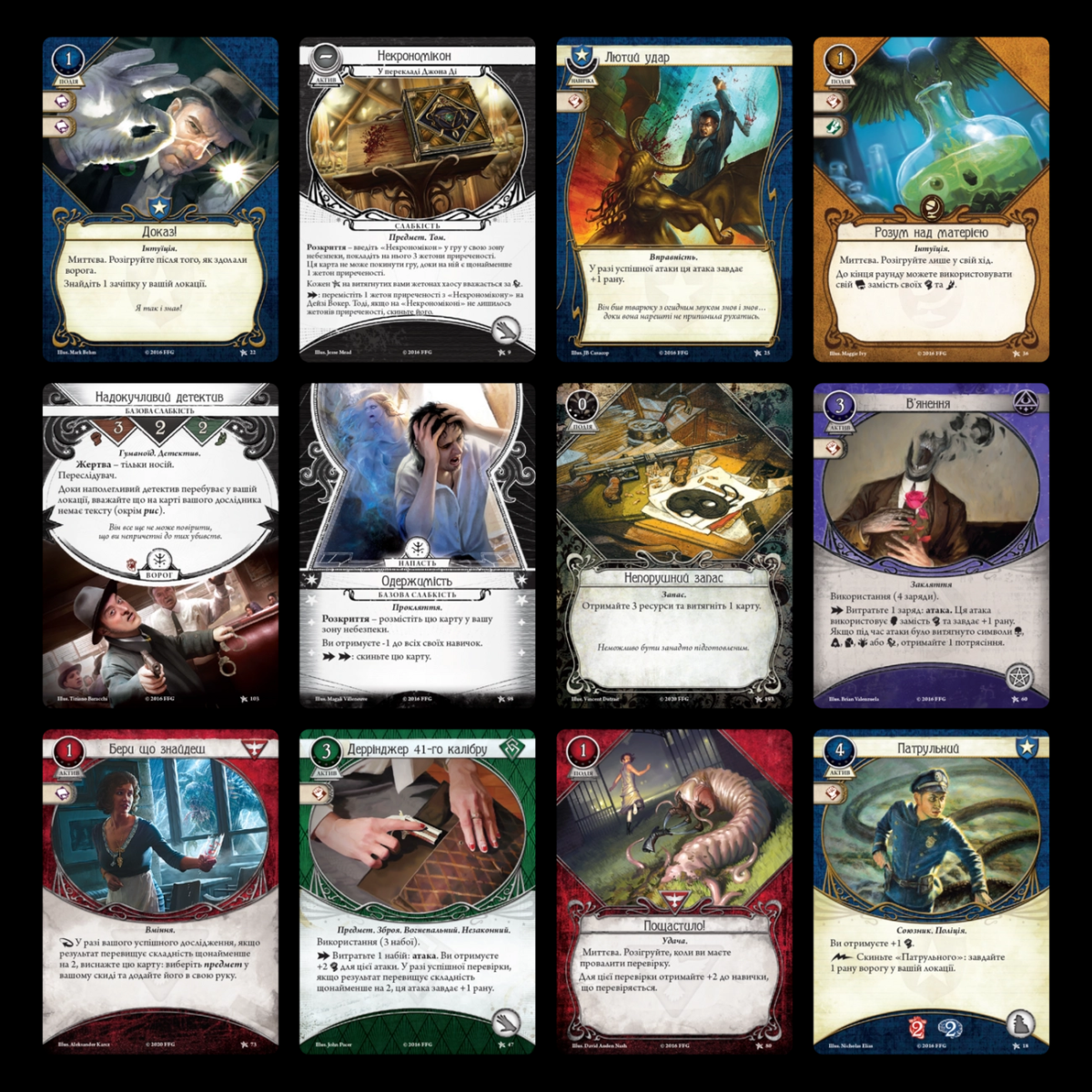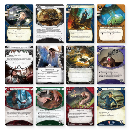 Настольная Живая Карточная Игра (ЖКИ) «Ужас Аркхэма. Карточная игра» продолжает весьма успешную линейку карточных приключенческих игр от всемирно известной компании «Fantasy Flight Games». Несколько лет тому назад, они уже делали попытку создать ЖКИ в мире Г.Ф. Лавкрафта, под названием «The Call of Cthulhu», которая, к слову сказать, была весьма успешным проектом, хоть и с немного иной игровой концепцией. В этот раз, учитывая опыт предыдущих игр, а особеннно ЖКИ «Lord of the Rings The Card Game», FFG выпустила потрясающе интересную новую игру, которую нам не терпится представить вам. Итак, многострадальный городок Аркхем. Сколько пробуждений древних видел он в своей истории. Сколько культистов, монстров и катаклизмов терзали его улицы, дома и окрестности. И вновь мы возвращаемся сюда, чтобы раз и навсегда бросить вызов древнему злу. Каждый игрок получает карту персонажа. Их в базовой версии игры – пятеро. Тут и бывший бандит, и федерал, и библиотекарь. В общем, обычные люди, которые волей судьбы столкнулись с неописуемым ужасом. Каждый игрок обладает собственной колодой карт, токенами здоровья, рассудка, а также фишками ресурсов. Соответственно, здоровье и рассудок отображают физическую и ментальную способность персонажей противостоять монстрам. Если в любой момент игры один из этих параметров опустится до нуля, игрок проигрывает партию. Очки ресурсов используются для оплаты розыгрыша карт.
