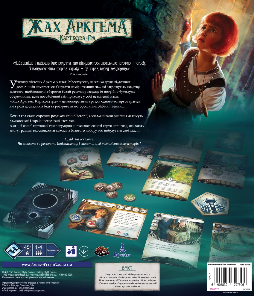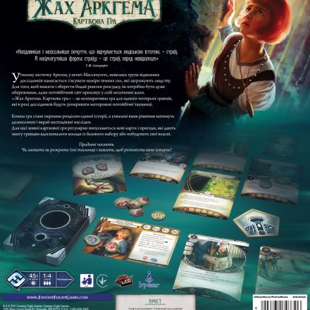 Комплектация:234 карты,5 мини карт,44 жетона хаоса,30 жетонов улик,18 жетонов рассудка,27 жетонов здоровья,правила игры,справочник по игре.