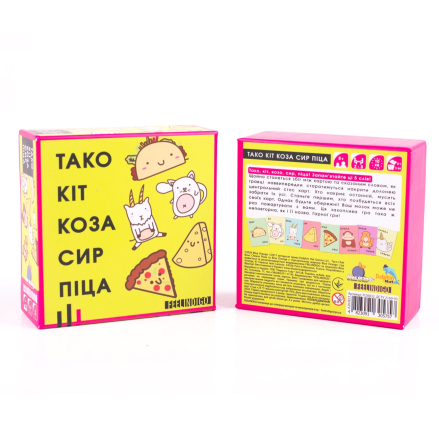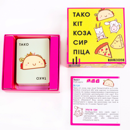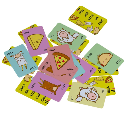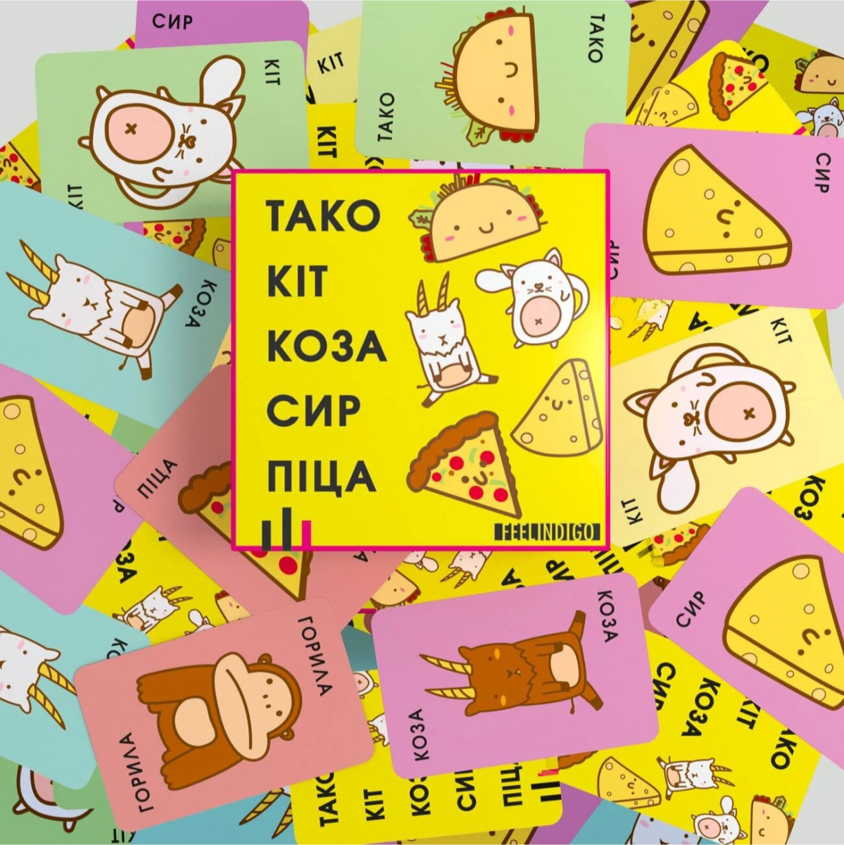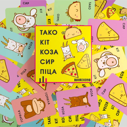 Быстрая карточная игра для веселой компании. Настольная игра «Taco Cat Goat Cheese Pizza» была разработана в 2018 году. Это очень прикольный филлер для детей и взрослых.